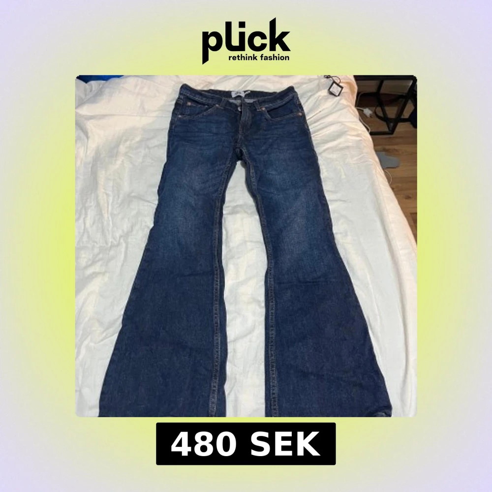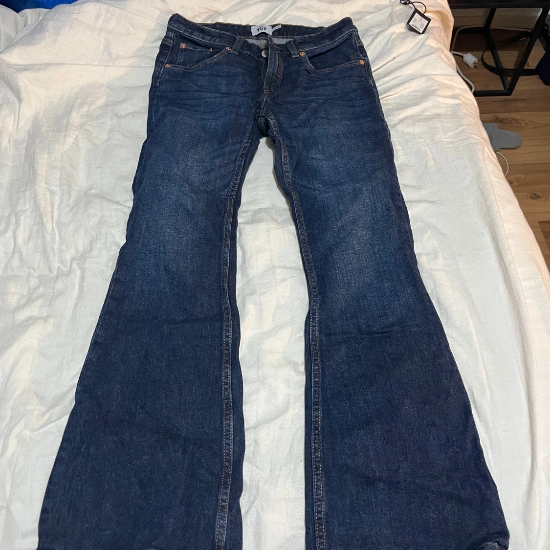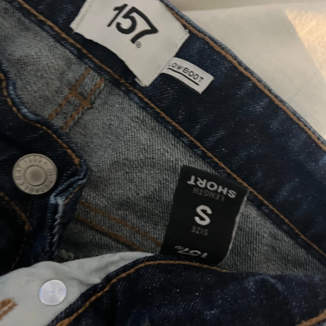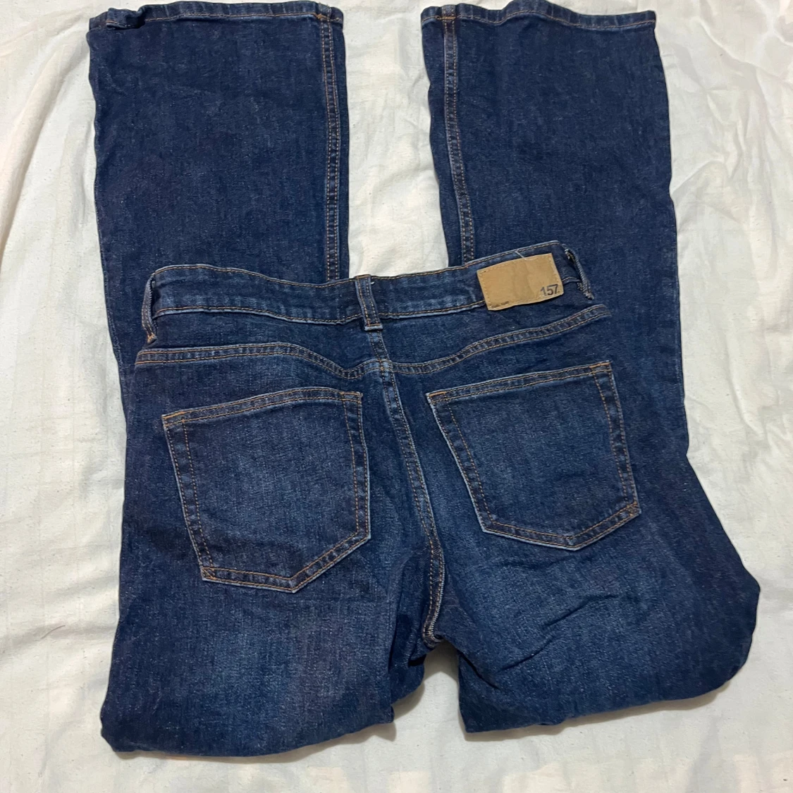 Snygga blå bootcut jeans från 157 i storlek S med kort benlängd. Klassisk femficksmodell med orangea sömmar och normalhög midja. Jeansen är tillverkade i ett robust denimtyg som ger en tidlös look och passar perfekt till sneakers eller boots.