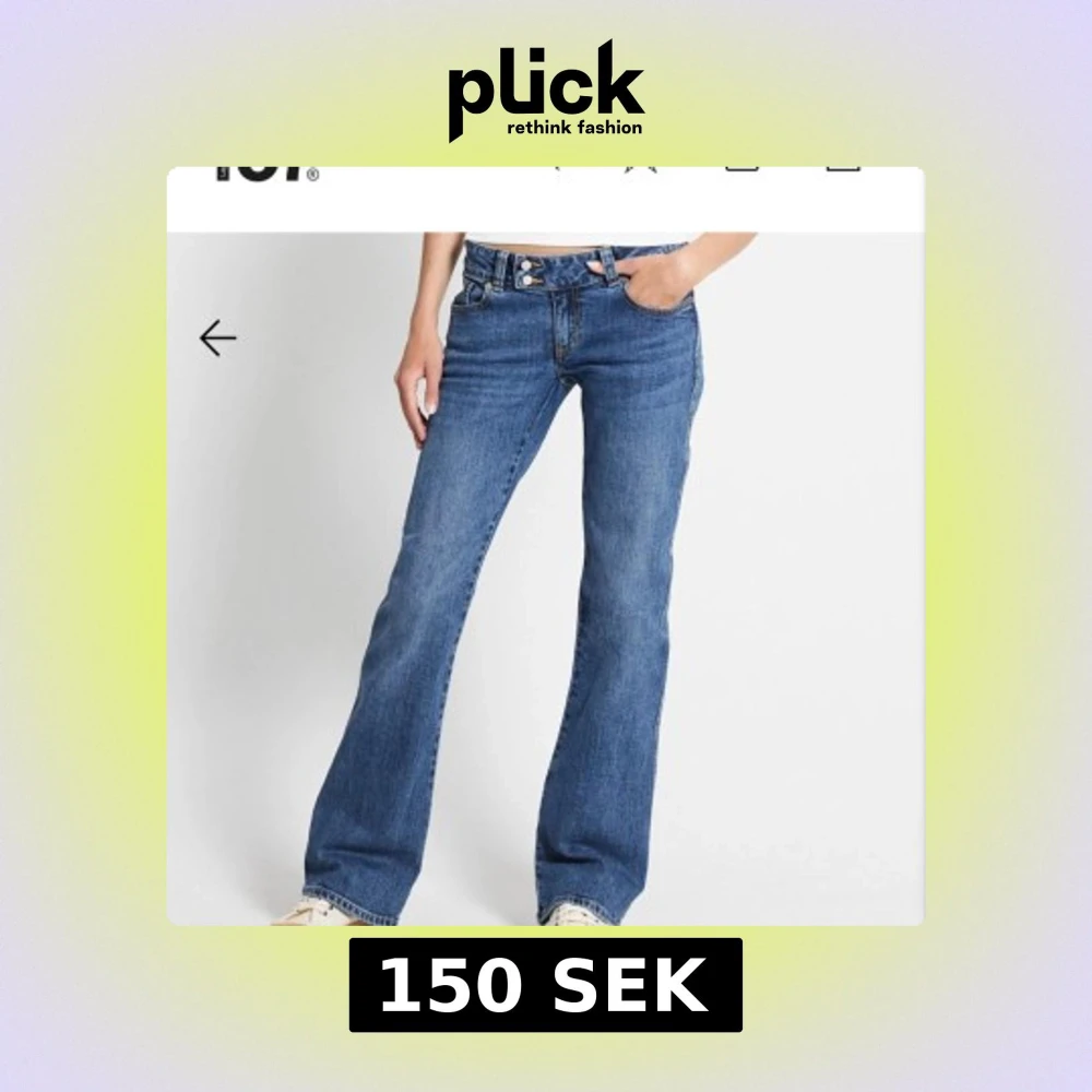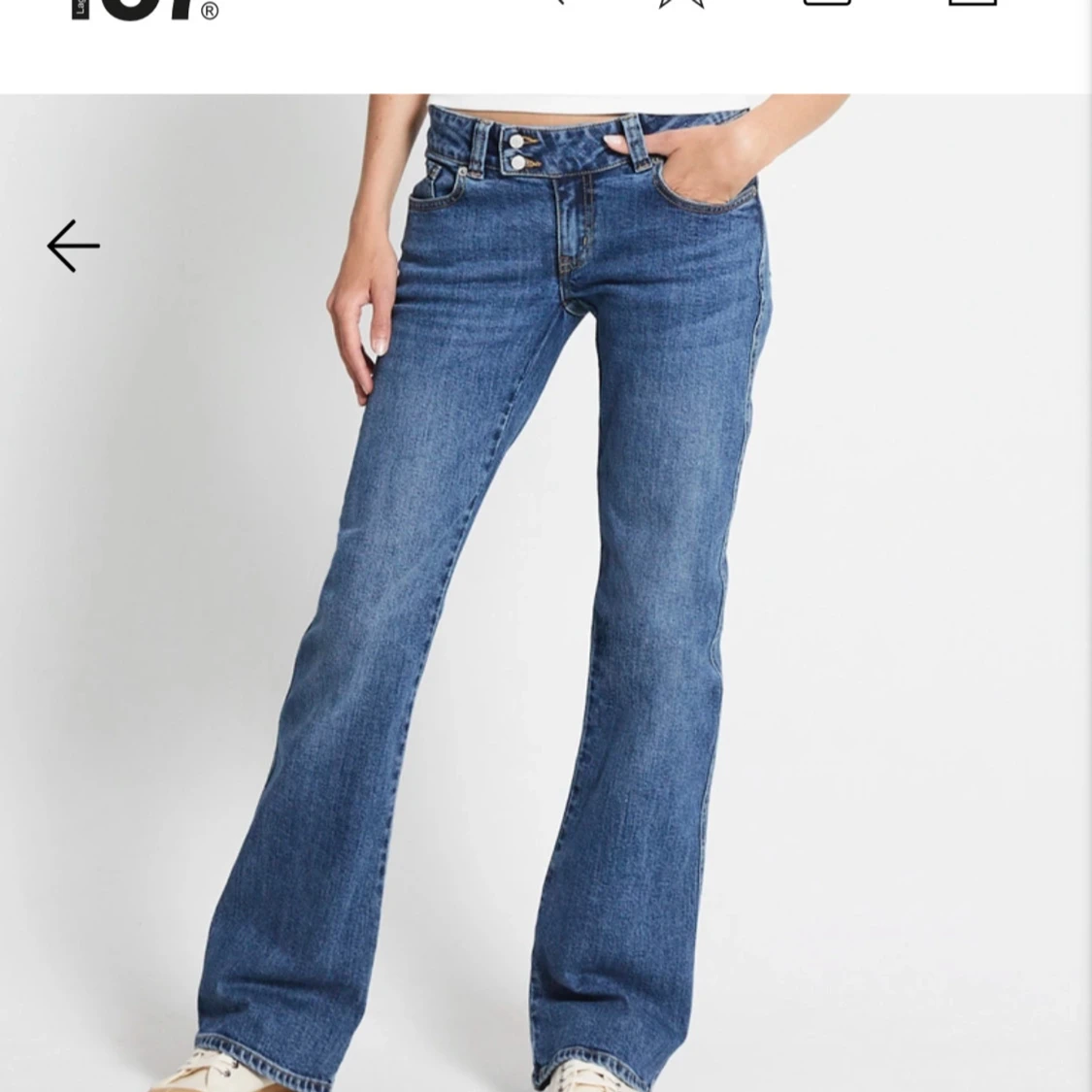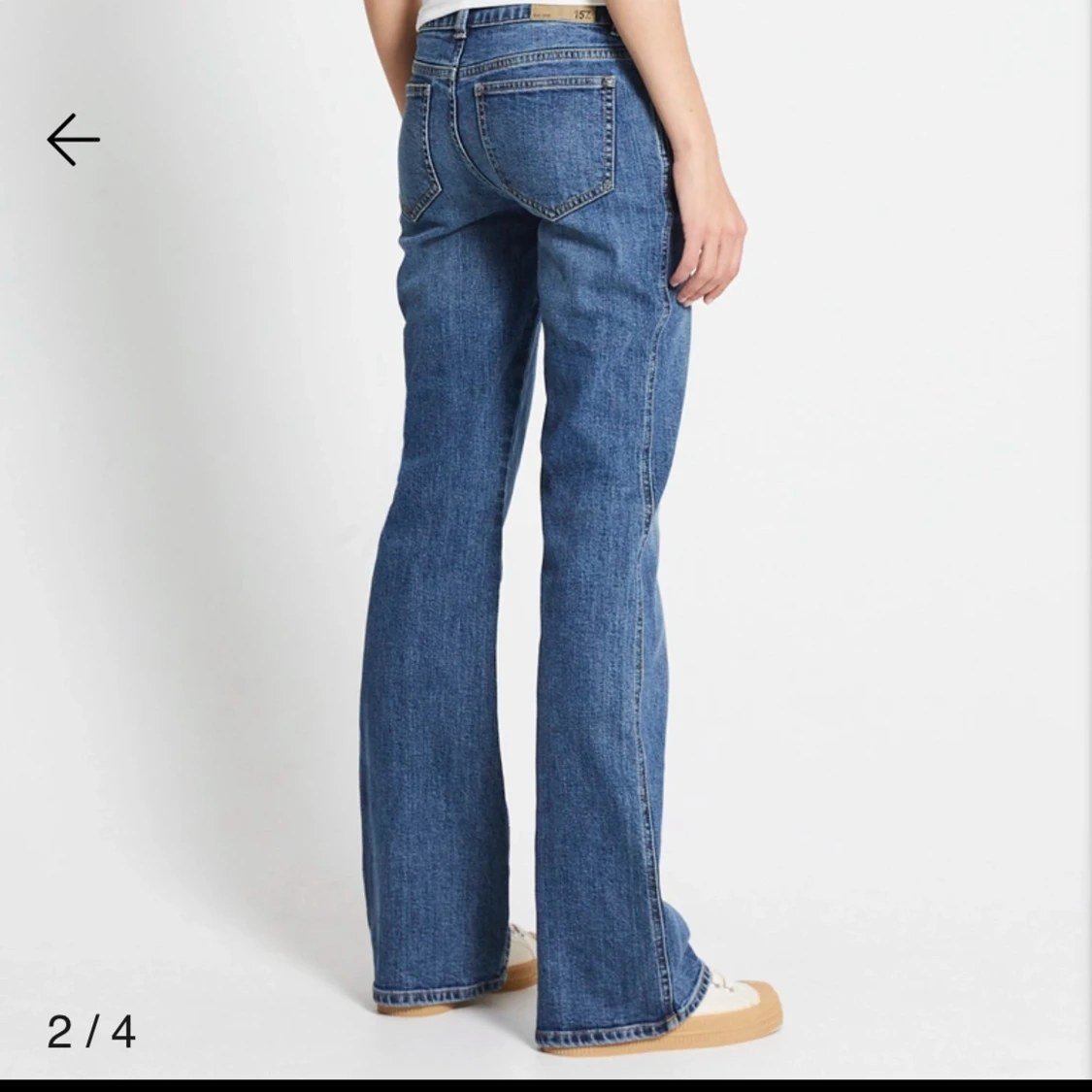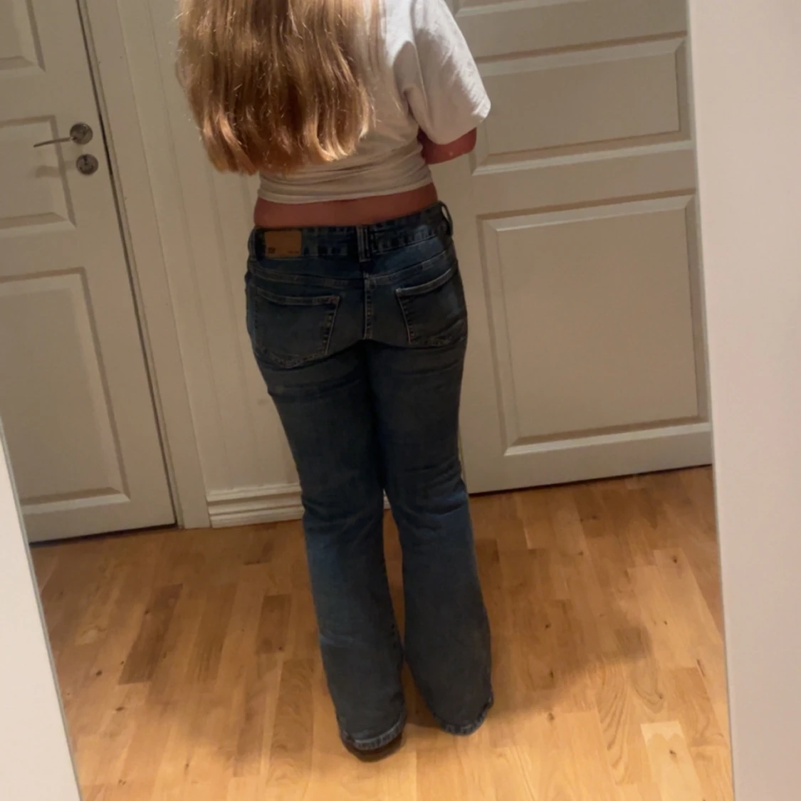 De har låg midja, bootcut-ben och femficksdesign. Jeansen har dubbla knappar i midjan och är tillverkade i slitstarkt bomullsjeans. Perfekta för dig som gillar retrovibbar och snygg passform. Använda fåtal gånger