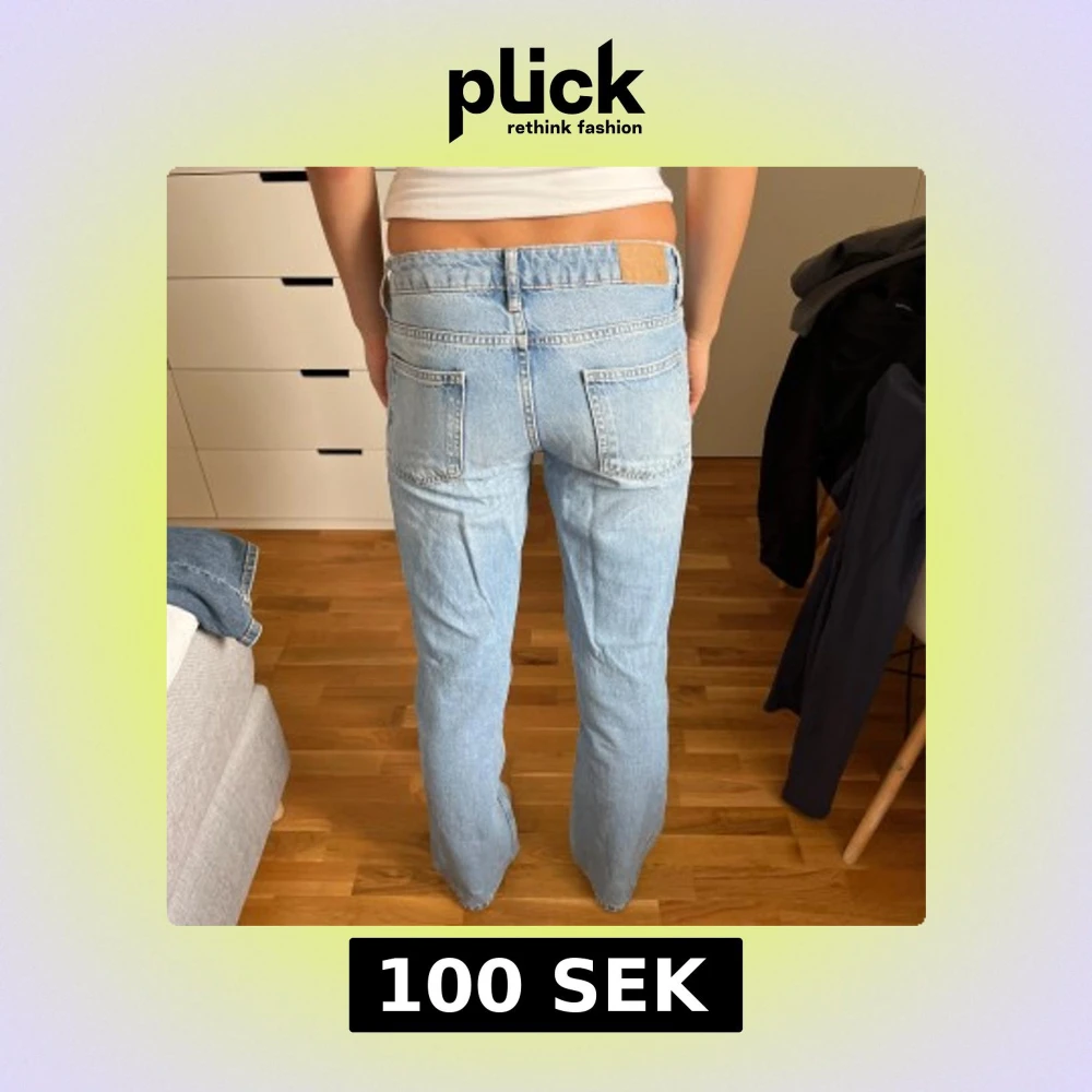 Säljer ett par klassiska jeans i ljusblå tvätt. Jeansen har rak passform med lätt bootcut, fem fickor och knappgylf. De är tillverkade i slitstarkt bomullsjeans.