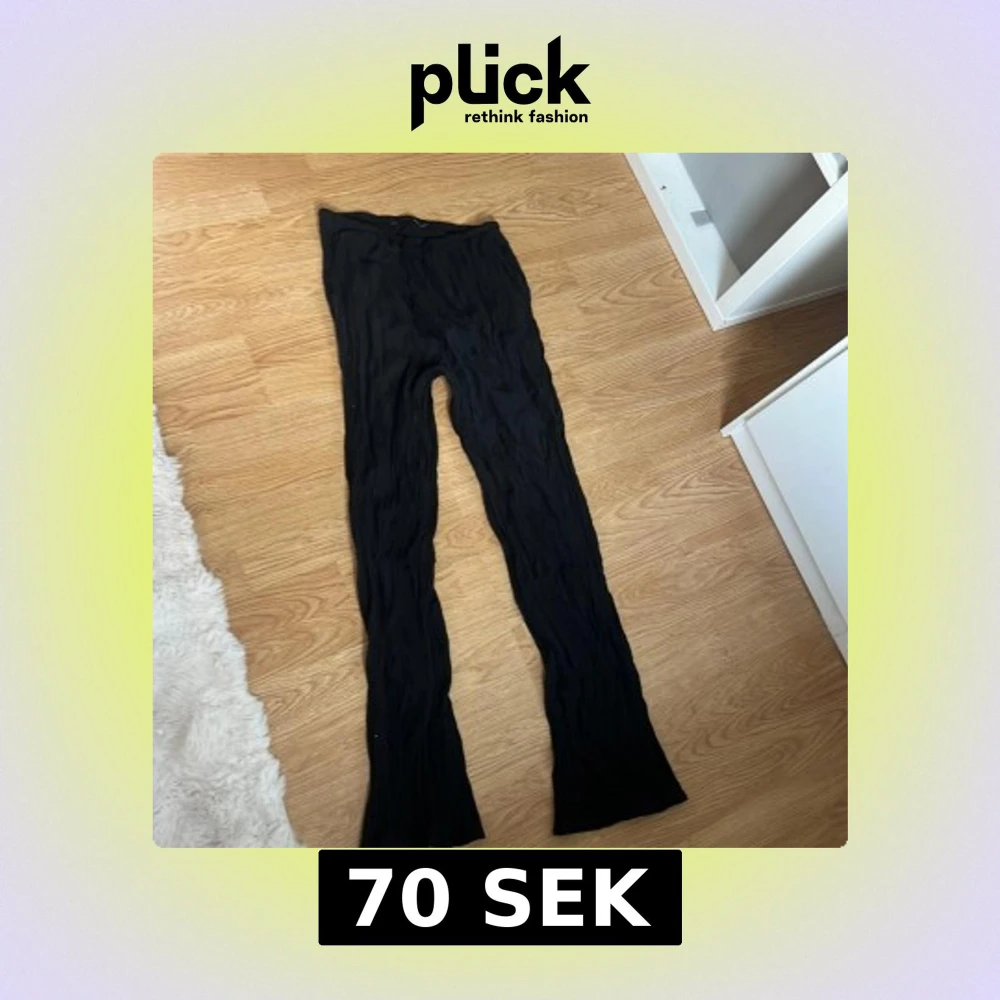Svarta byxor med hög midja och vida ben i ett snyggt crinkle-material. De har en elastisk midja och är riktigt sköna och lätta att bära. Perfekta om du gillar en avslappnad men trendig look.