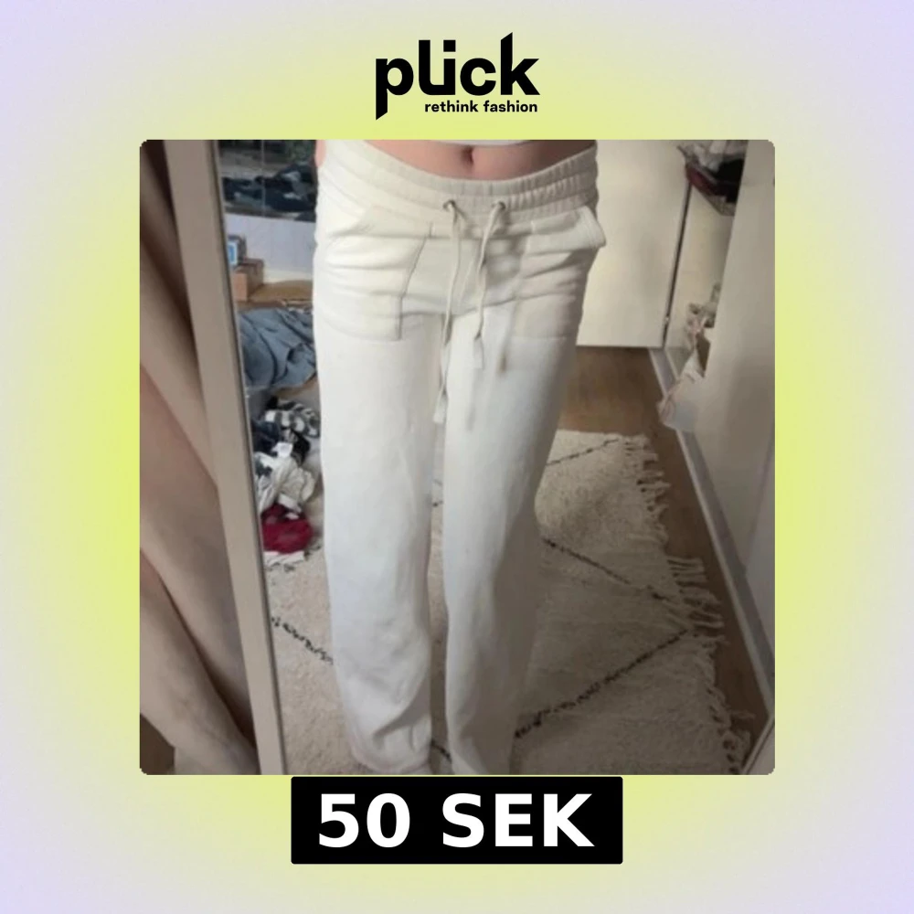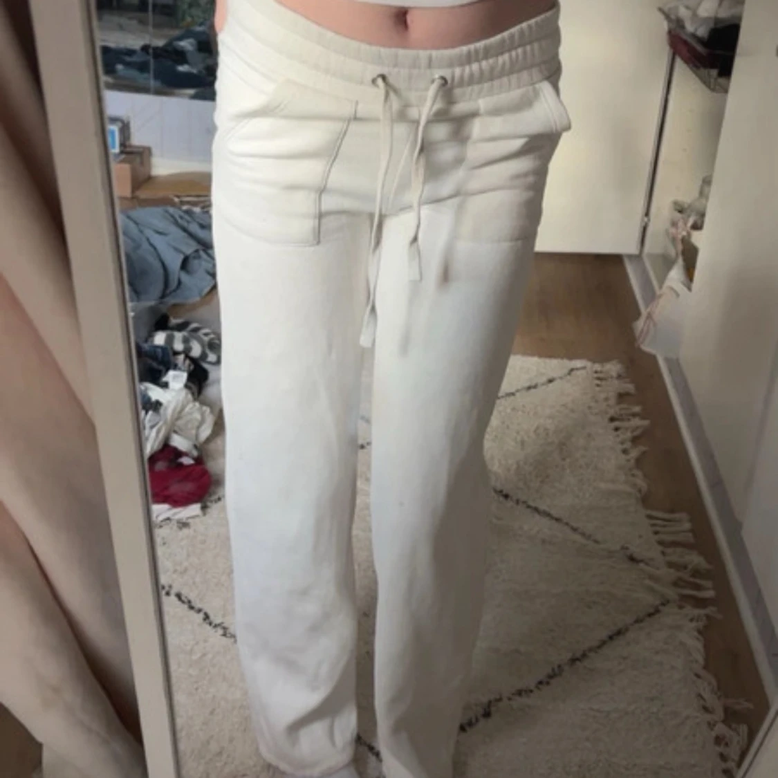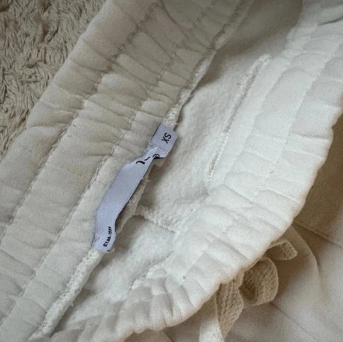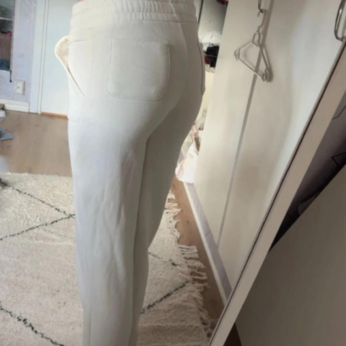 Vita mjukisbyxor i storlek XS med bred resår i midjan och snörning framtill. Byxorna har raka ben, sidofickor och en bakficka. Tillverkade i mjukt bomullsmaterial, perfekta för chill dagar eller när du vill vara extra bekväm.