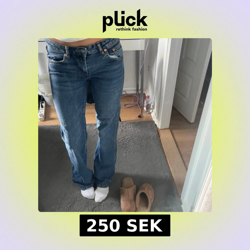Säljer ett par klassiska blå jeans med raka men även lite utsvängda ben och snygga fickdetaljer bak. Jeansen har normal midja och är i ett mjukt denimtyg med coola sömmar och knappar i silver och brons. Perfekta för en chill och stilren look.
