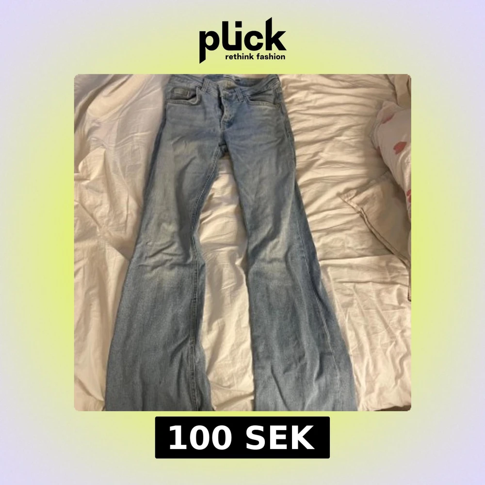Säljer ett par ljusblå jeans med bootcut-modell. Jeansen har klassisk femficksdesign, normal passform och är tillverkade i mjukt denimtyg. Perfekta för dig som gillar retrovibbar och vill ha ett par snygga jeans med utsvängda ben.