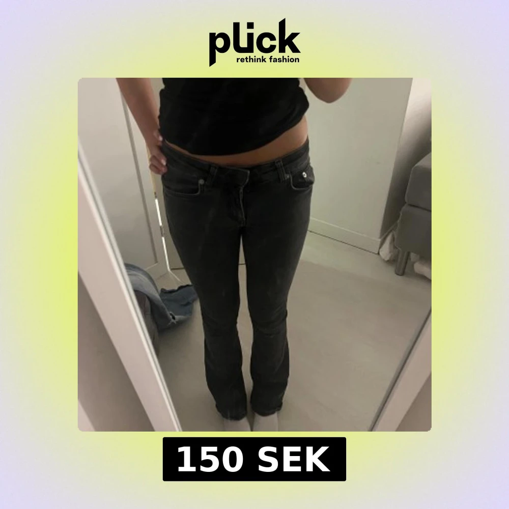 Säljer ett par svarta jeans med lätt tvättad look och bootcut-ben. Jeansen har små hål på knäna men inget jag märkt av när jag använt dom. Midjemåttet är 32cm, innebens längden är 80cm