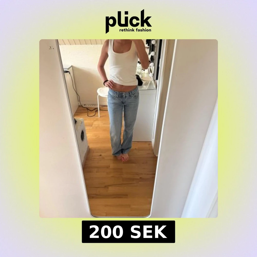 Säljer ett par ljusblå jeans från 157 i storlek XXS. Jeansen har låg midja och raka ben med en avslappnad passform.