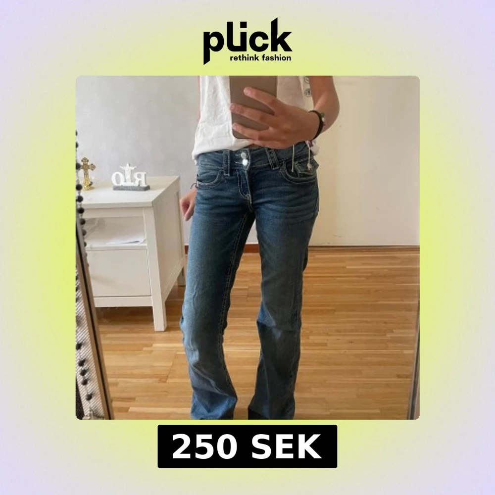 Säljer ett par blå bootcut jeans låg midja. Jeansen har klassisk femficksdesign och dragkedja med dubbelknapp. Köpa på Gina tricot i storlek 152 (barn storlek) men passar storlek XS.