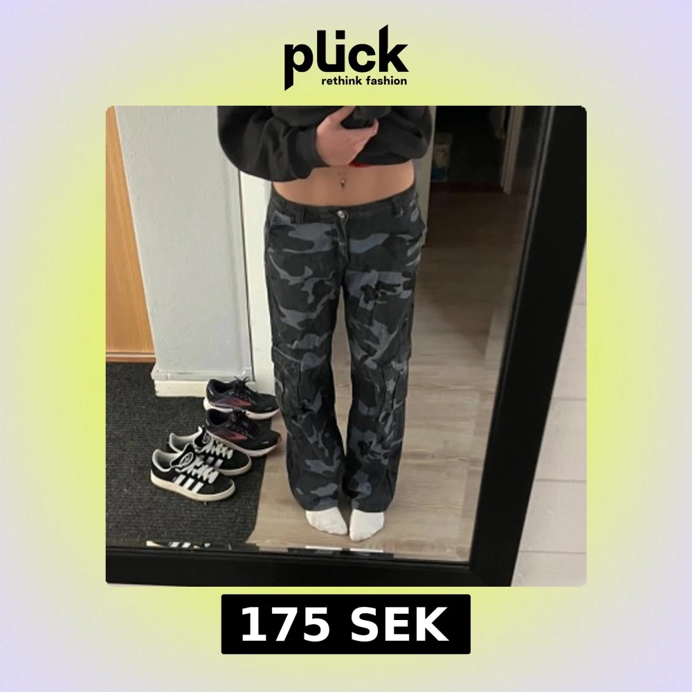 Säljer ett par coola camouflage cargobyxor i marinblått. Byxorna har flera praktiska fickor och en baggy passform. Säljer då jag har bytt stil. Jag är 171cm lång