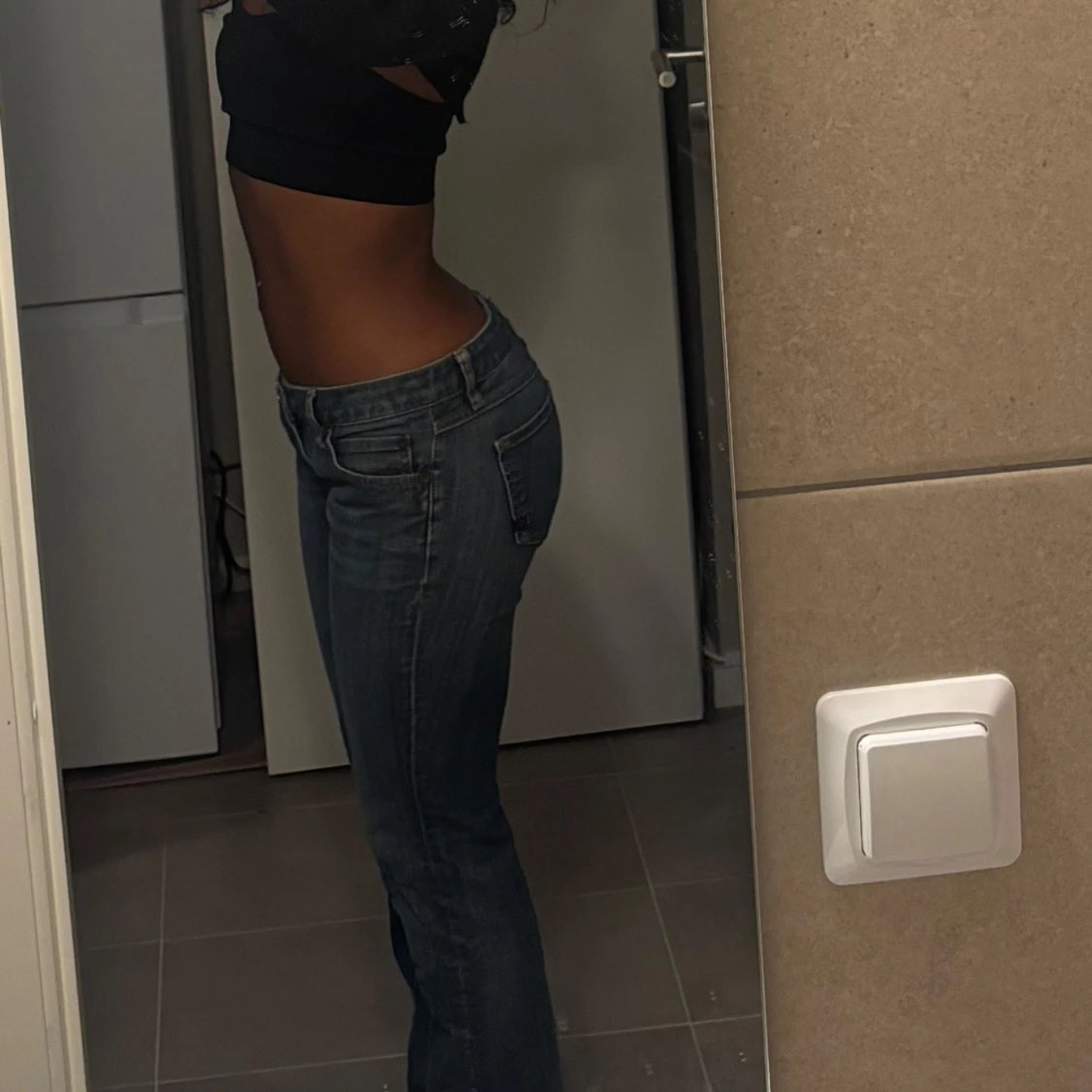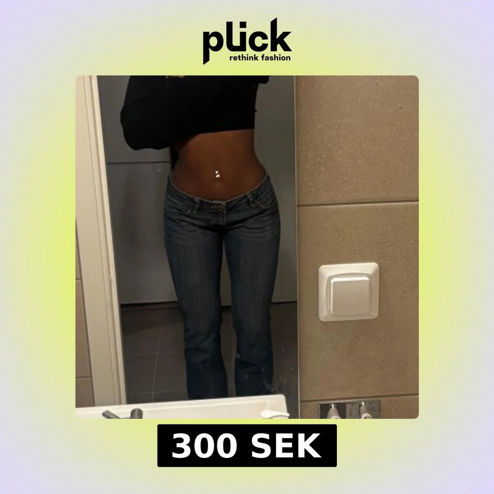Säljer ett par klassiska blå lågmidjade jeansbyxor med raka ben. Jeansen har knapp- och dragkedjestängning framtill samt fem fickor. Perfekta för en avslappnad och trendig look.