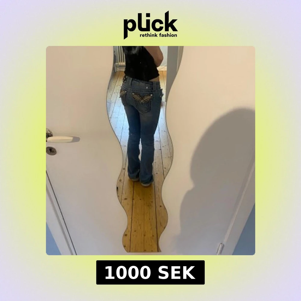 Snygga blå bootcut miss me jeans med svin snygga bakfickor. Jeansen har låg midja och en klassisk femficksdesign. Dem är storlek w26 och jag är en och 166 och är långa för mig