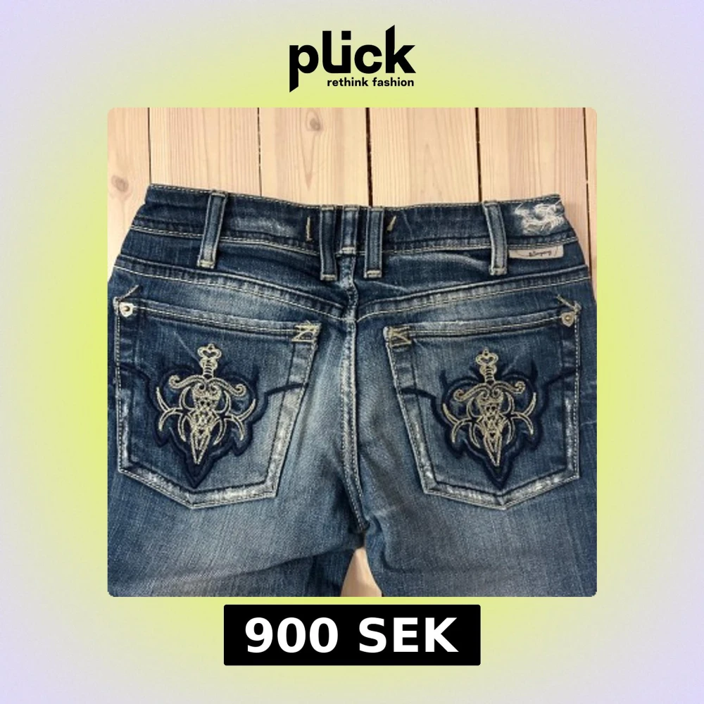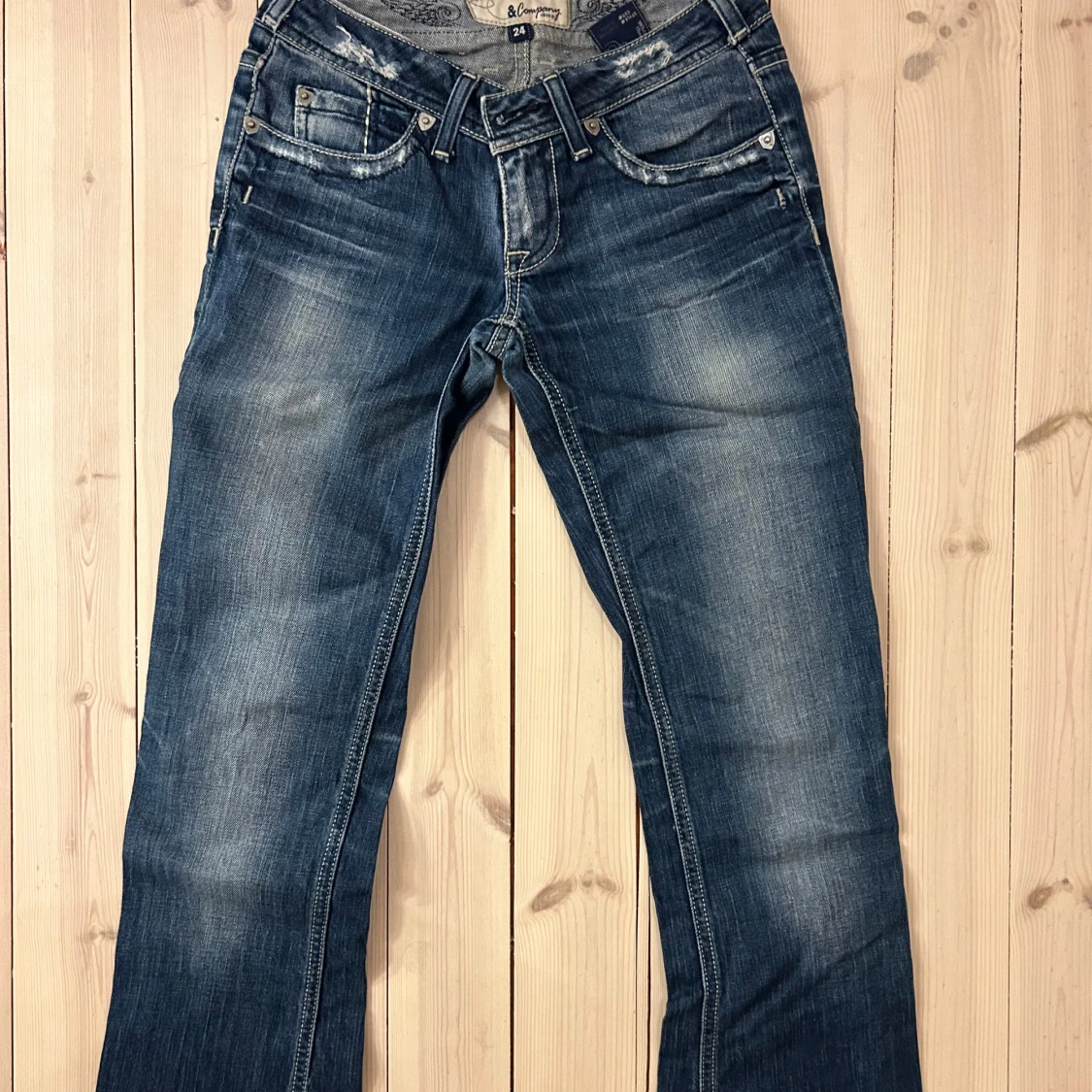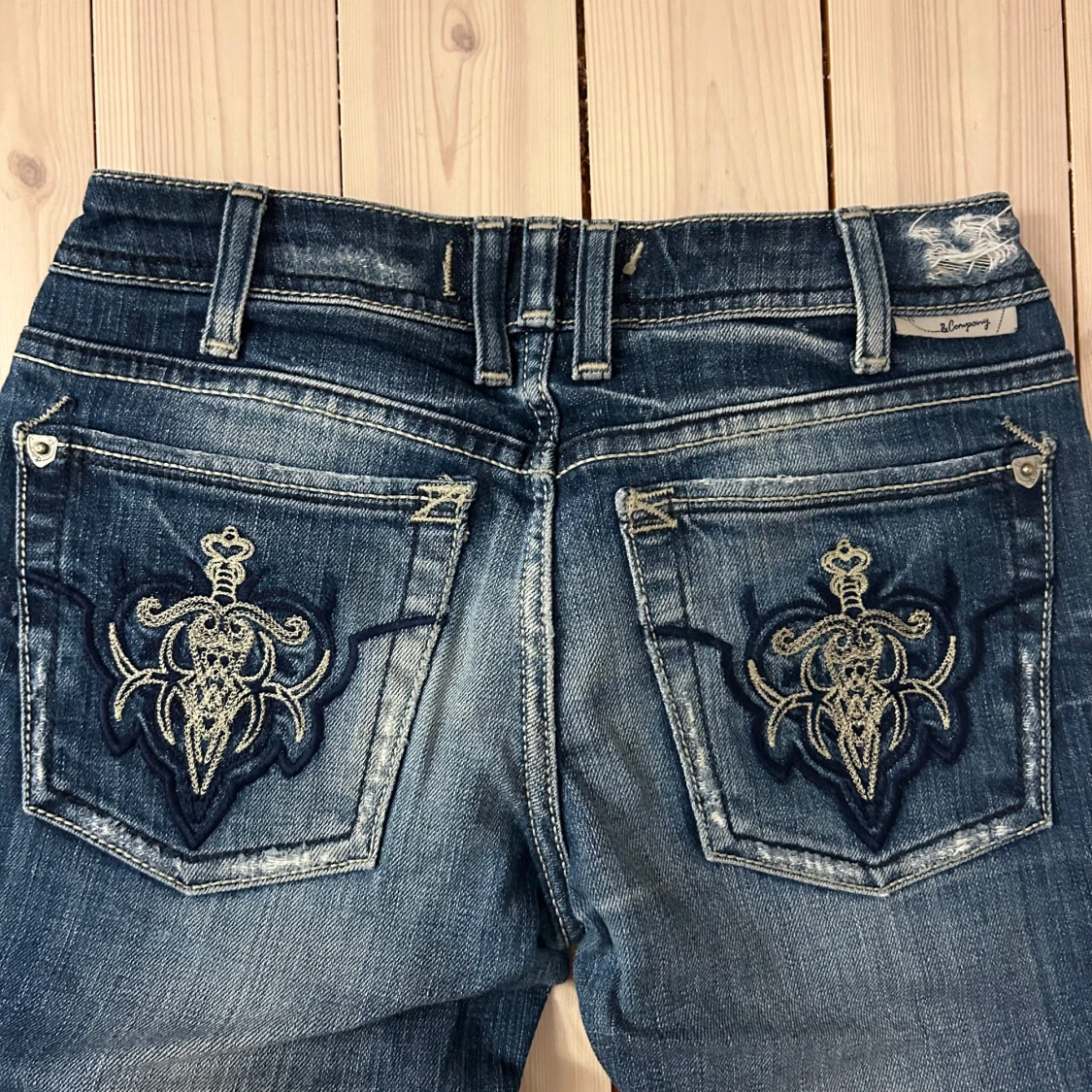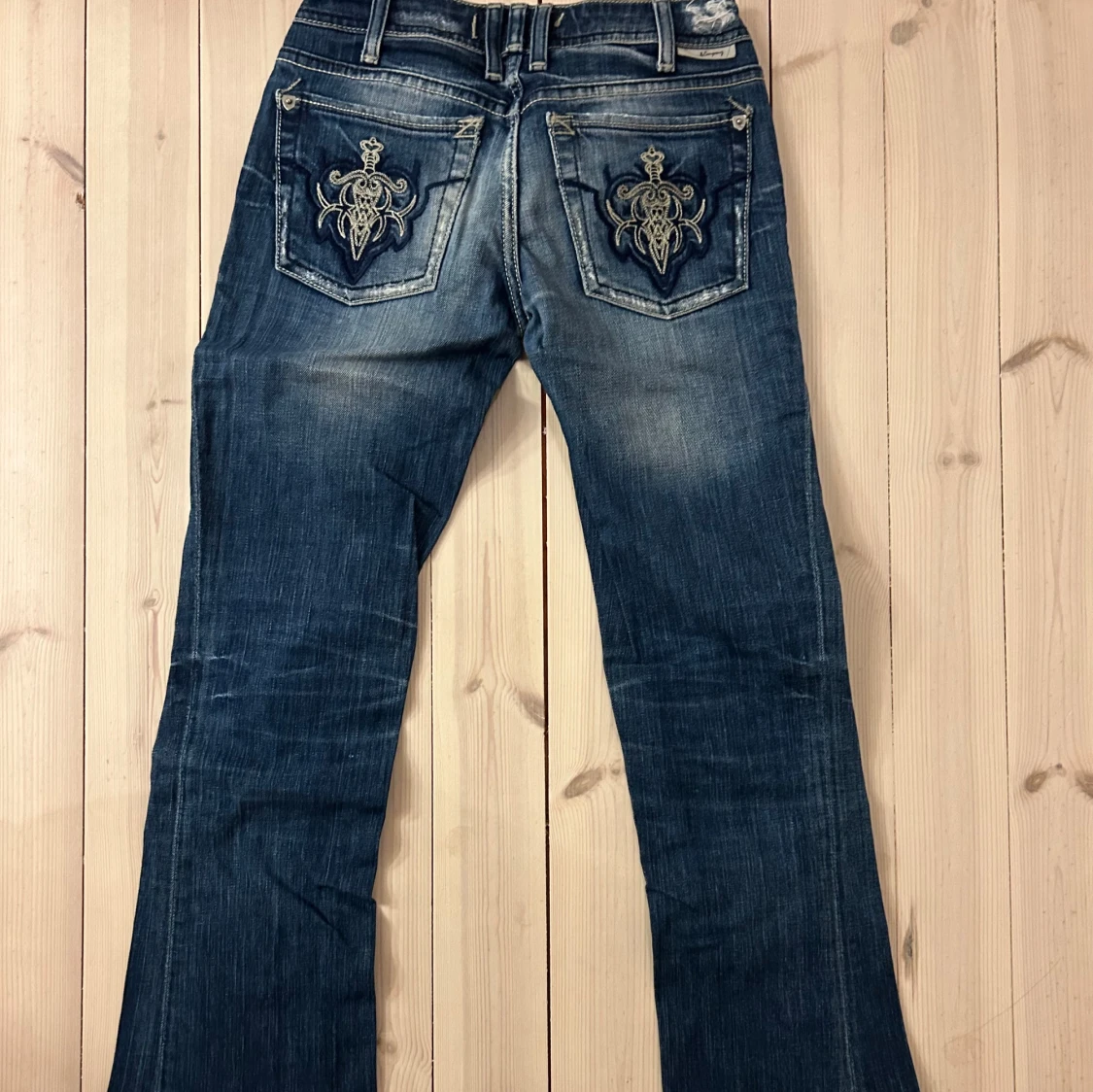 Lågmidjade bootcut jeans från Jcompany med broderier på bakgickorna, och slitna detaljer. Färgen är mellanblå med ljusare tvättade partier. De är i storlek 24, men de är dessutom avkortade. Säljer då de ej längre passar!