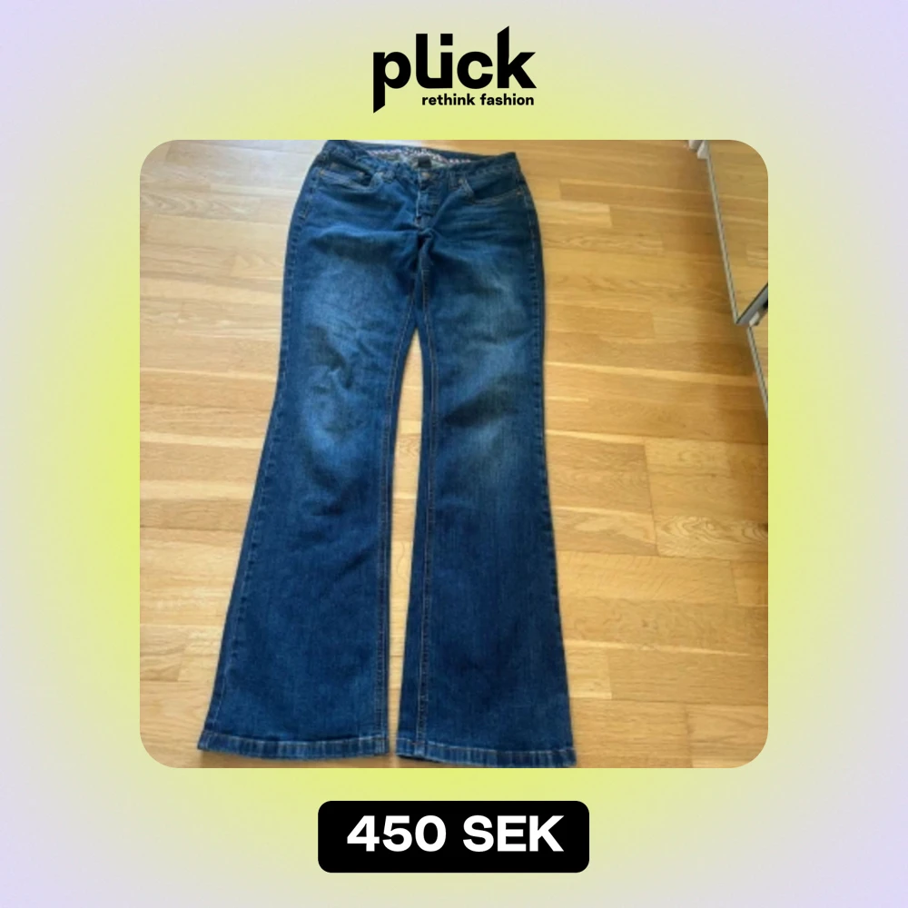 Lågmidjade utsvängda bootcut jeans med fina broderi detaljer på bakfickorna, från John Baner. Midjemått: 76 cm Innerbenslängd: 85 cm Hela längden: 105 cm