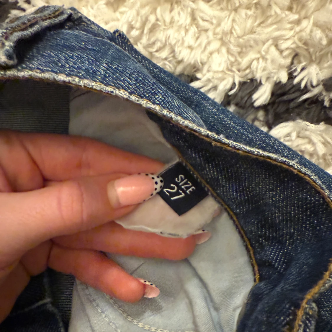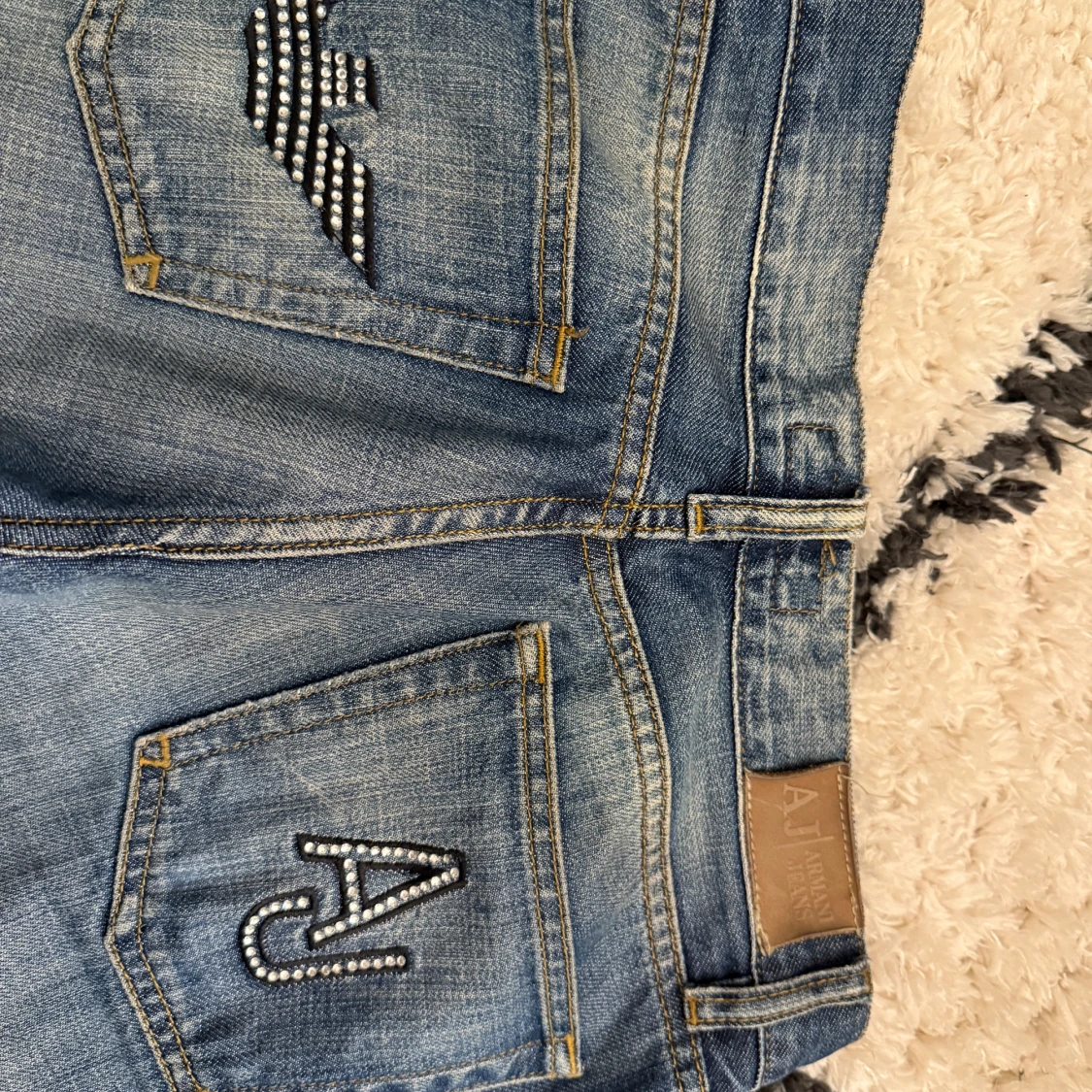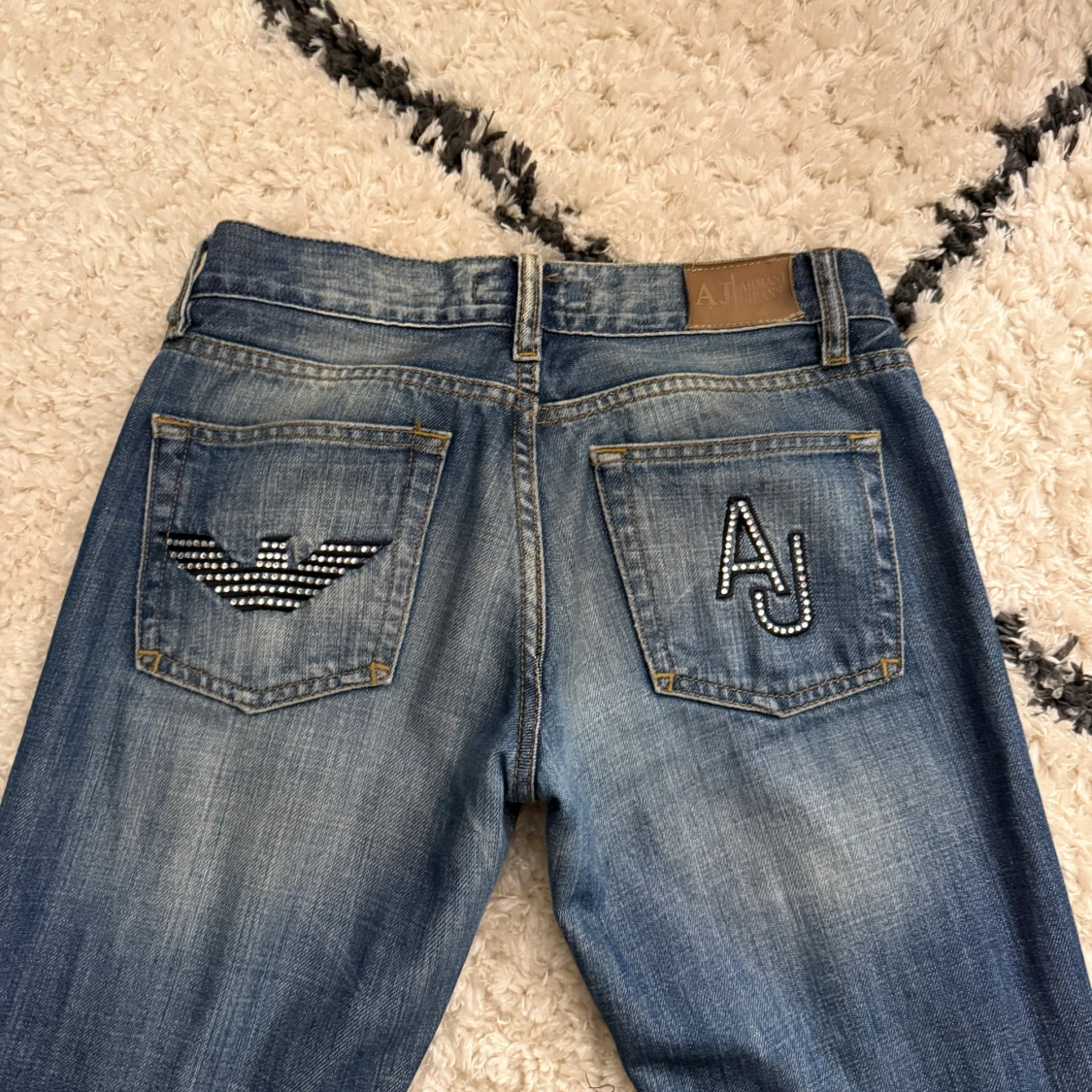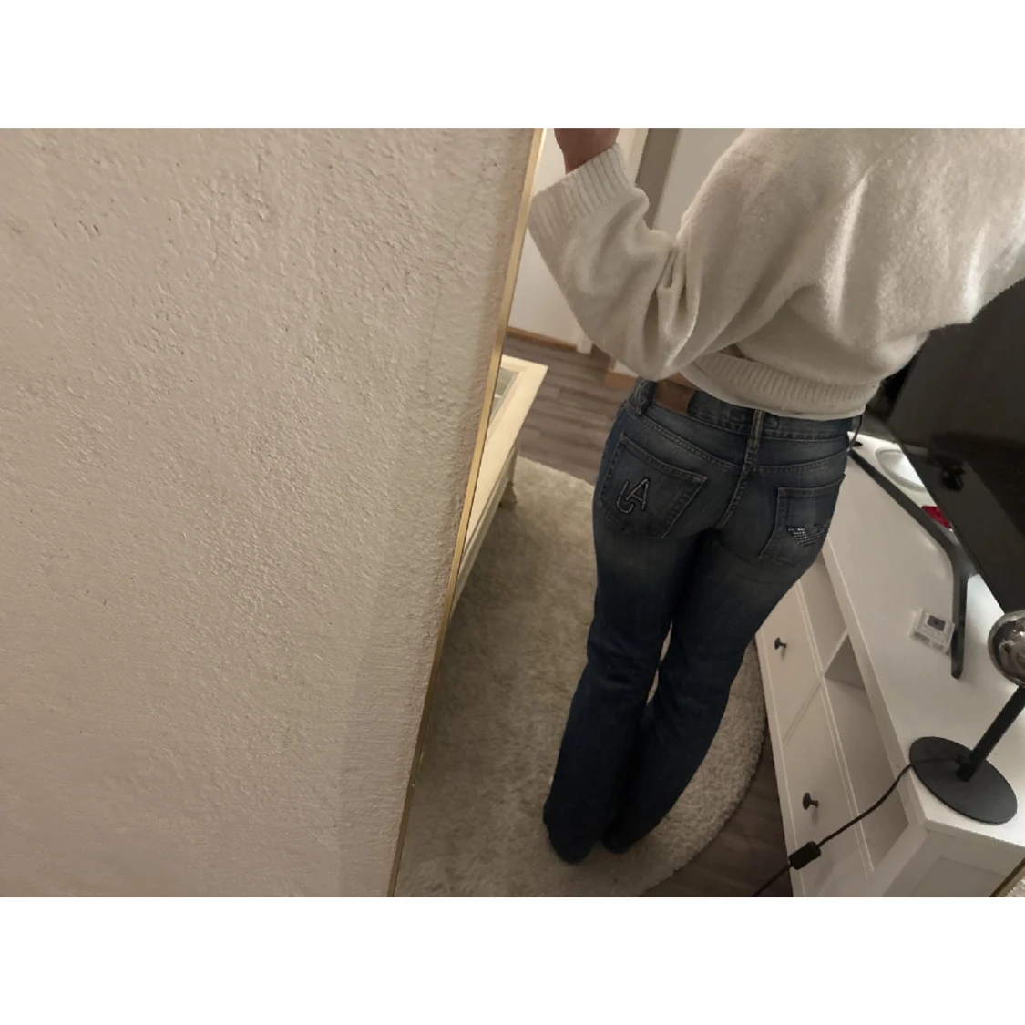 Jätte jätte snygga blåa lågmidjade bootcut jeans ifrån Armani Jeans, snygga detaljer på fickorna bak, fått så många komplimanger! 💕storlek 27, passar mig som är 169cm. Köptes för 899kr.
