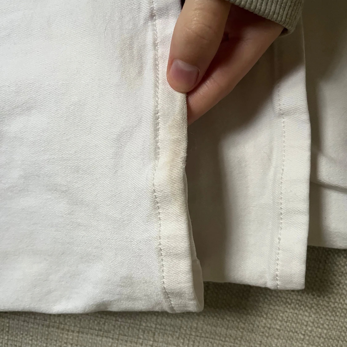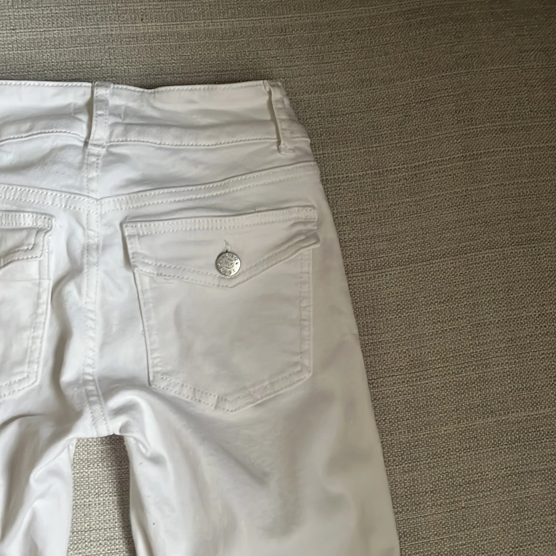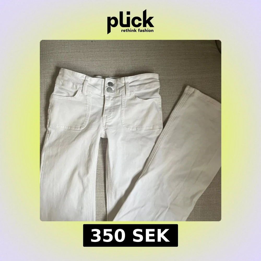 Säljer mina vita lågmidjade bootcut jeans med dubbla knappar fram. Perfekta för en stilren look. Säljer då de inte kommer till användning! Använda fåtal gånger och känns helt nya! Storlek 32, innerbenslängd 77cm och gren 16/17 cm. De har en liten brun fläck längst ner vid hälen (se bild 3) men inget som syns!