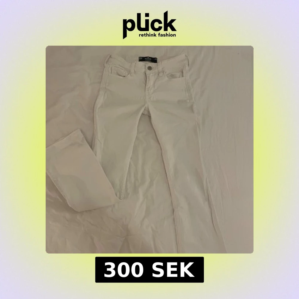 Säljer dessa lågmidjade vita bootcut jeans från Hollister! De är i storlek 000R, w23R och de motsvarar storlek XS💝