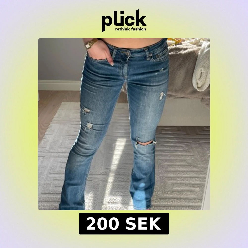 Säljer ett par blå bootcut jeans med slitningar för en coolare look. Jeansen har låg midja och är i ett mjukt denimtyg. Mycket bra skick! Hör av er vid frågor!💕