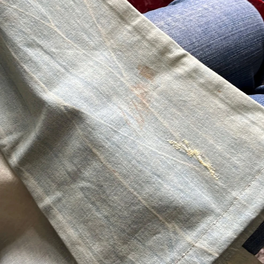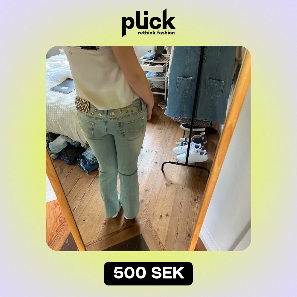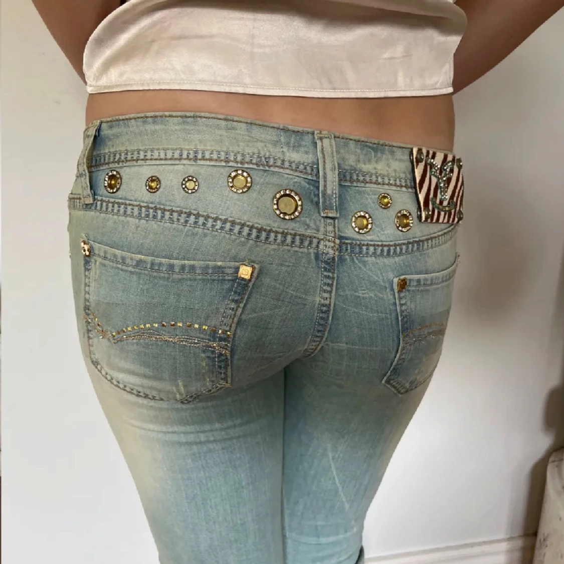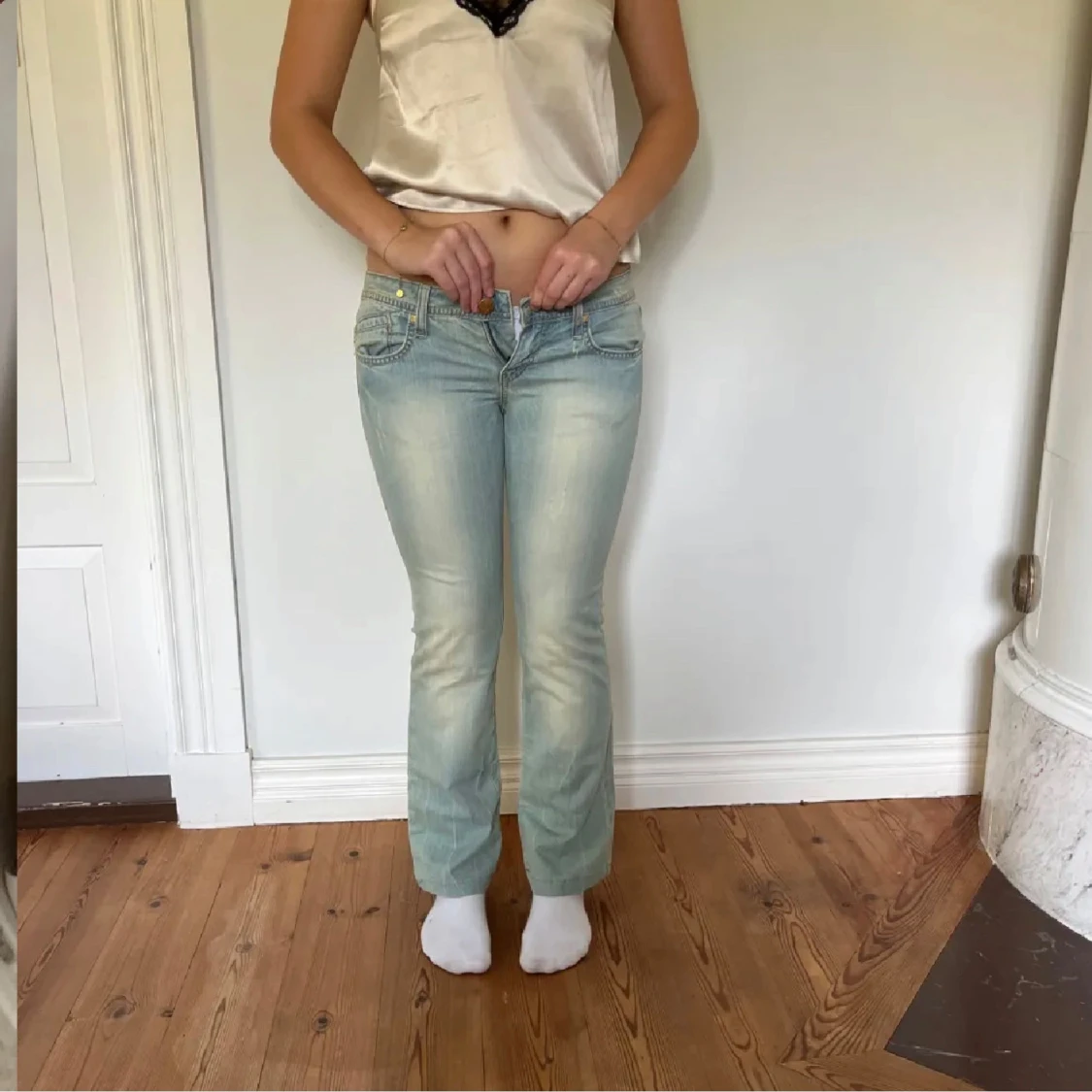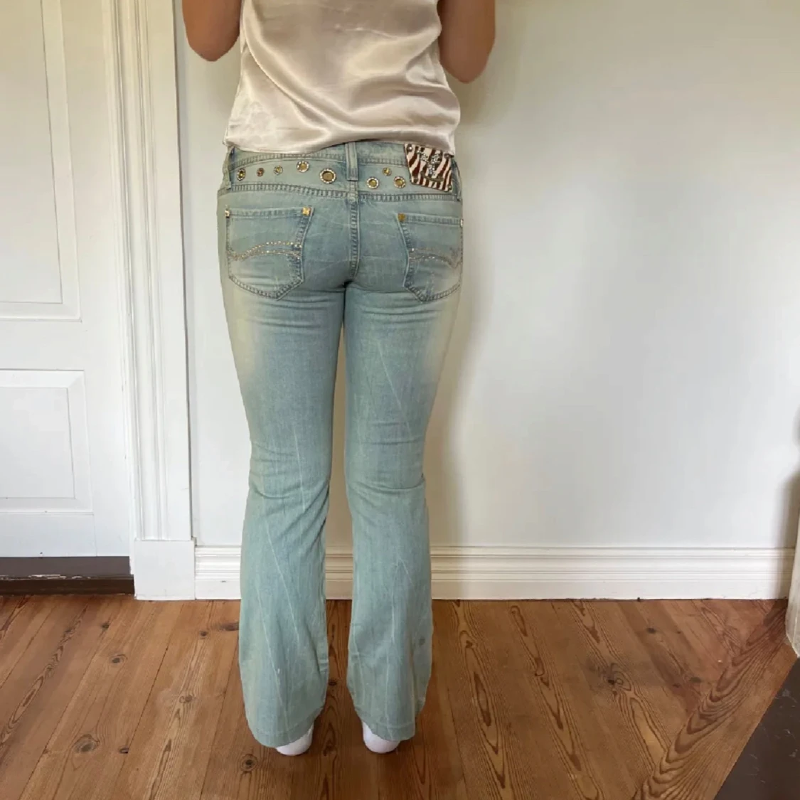 Ljusblå coola lågmidjade jeans, bootcut och snygga detaljer på baksidan🥰har sprättat upp längst ner för att de ska bli längre! Midjemått: 37 cm och Innerbenslängd: 75 cm. En av ”knapparna” där bak har ramlat av men skickar med den!! Går säkert lätt att laga🥰🥰