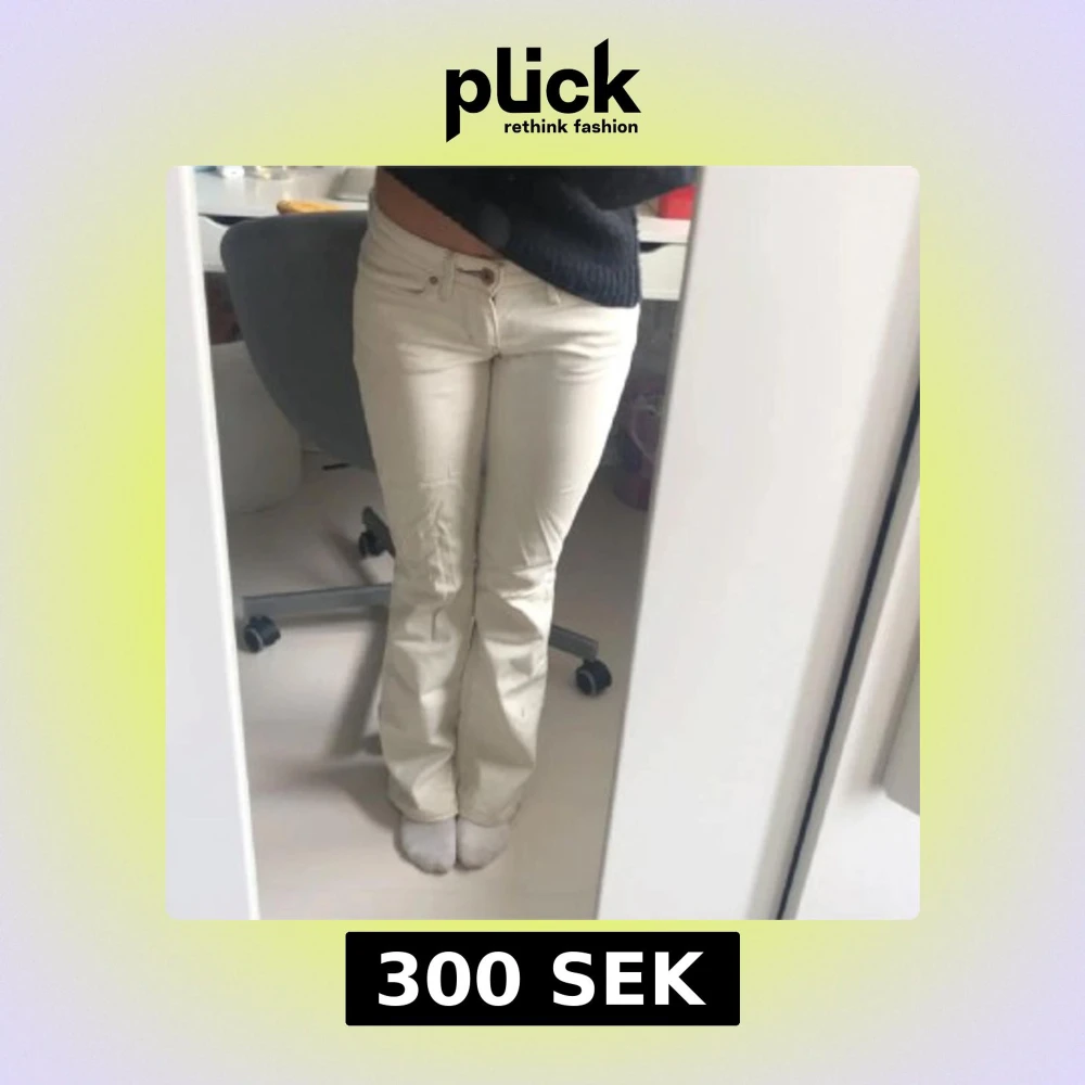 Säljer ett par krämvita lågmidjade bootcut jeans från Levi’s i strl. 24. Defekter på sista bilden där det är lite slitage vid hälarna samt en del fläckar, därav skicket.