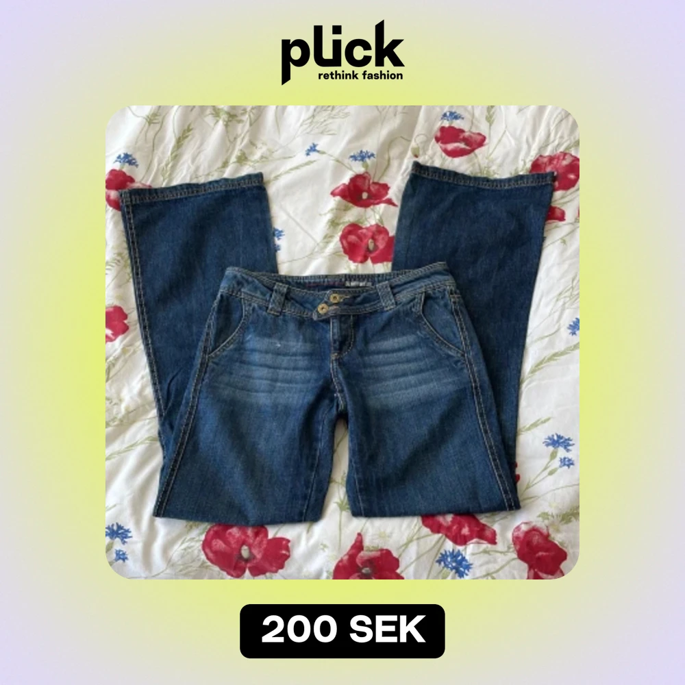 Fint skick, 100% bomull Storlek 28/34, skulle säga att de motsvarar storlek S Mått: Innebenslängd- 83cm Midja- 37cm(platt) Totallängd- 105cm OBS! Har inga bilder med jeansen på. Kontakta mig gärna om ni har frågor☺️