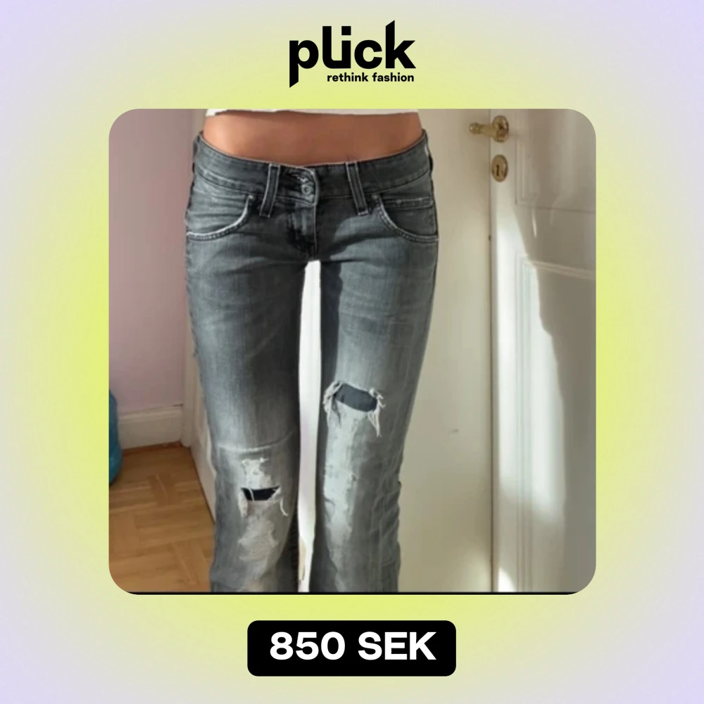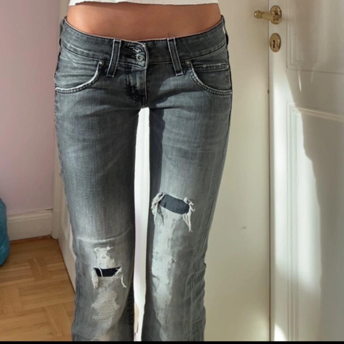 Säljer snyggaste Lågmidjade bootcut jeansen!!❤️vintage går inte att köpa längre. Mörkgrå med slitningar och väldigt låg midja💕först till kvarn!