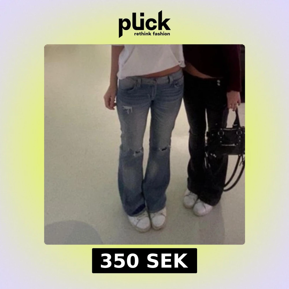 Säljer ett par blå lågmidjade jeans med bootcut passform. Jeansen har slitna detaljer och hål vid knäna för en trendig look. Perfekta för dig som gillar en avslappnad och cool stil.