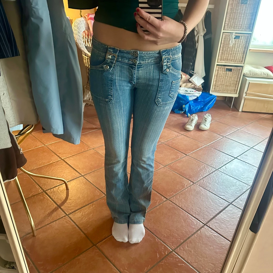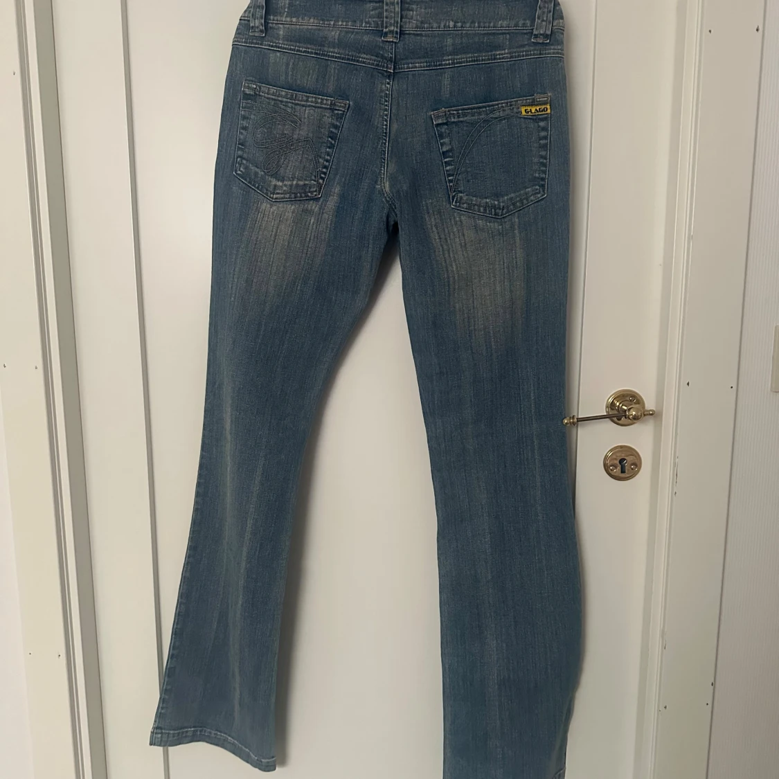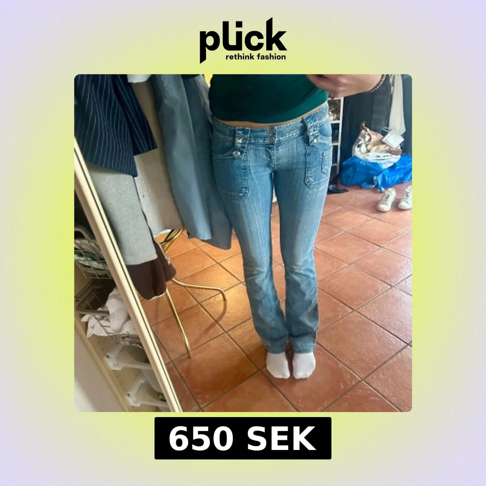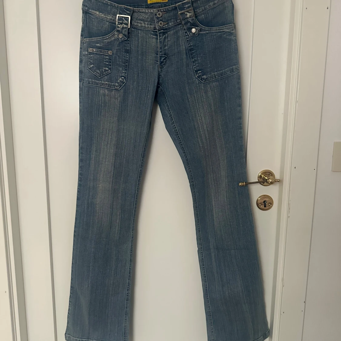 Säljer ett par blå lågmidjade bootcut jeans med låg midja och raka ben. Jeansen har coola detaljer som dubbla knappar, fickor med lock och dekorativa detaljer. Innerbenslängd:83 W:26 Dock väldigt stretchiga