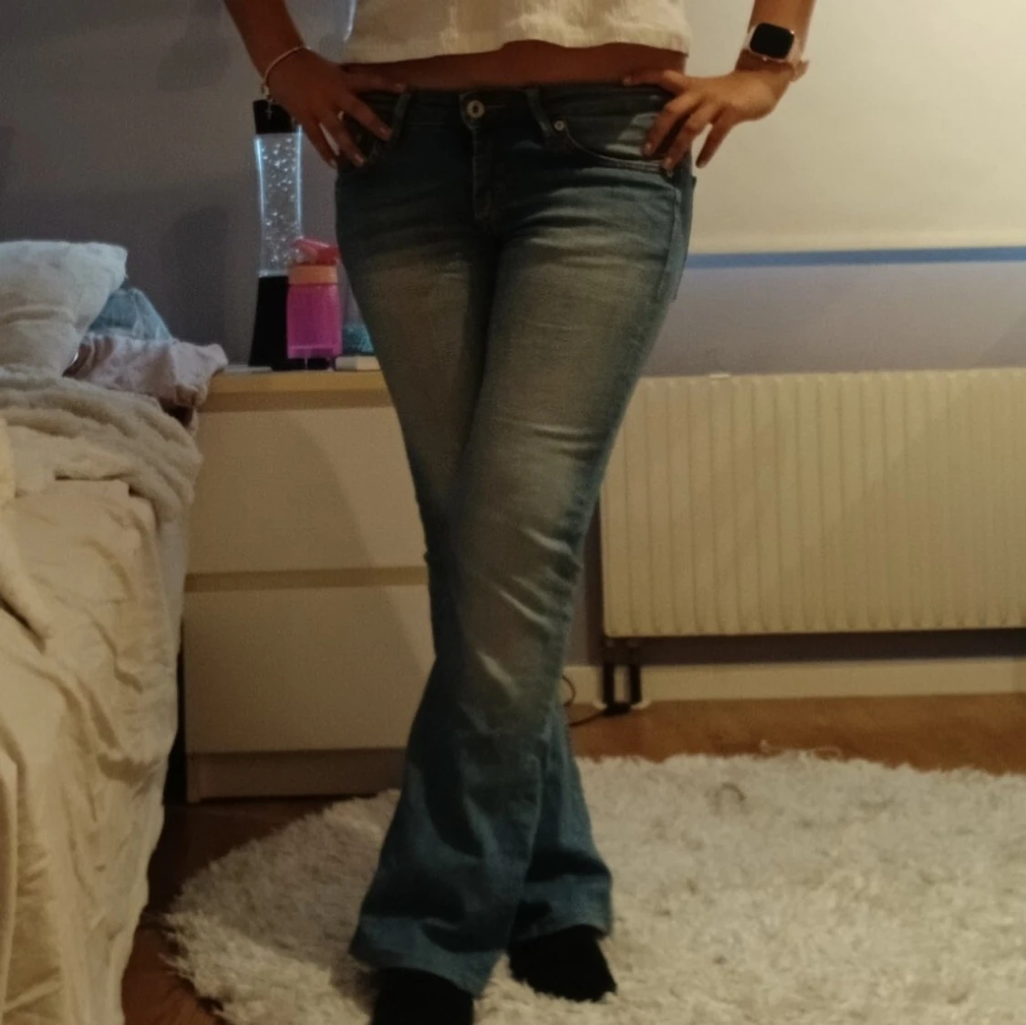 Snygga blå jeans med bootcut. Köpta från H&M och finns inte att köpa längre då de är vintage. En liten fläck på jeansen som inte försvinner i tvätt, därav priset. Går att se på sista bilden, går säkert bort om man försöker. Står ingen storlek men passar som en 34
