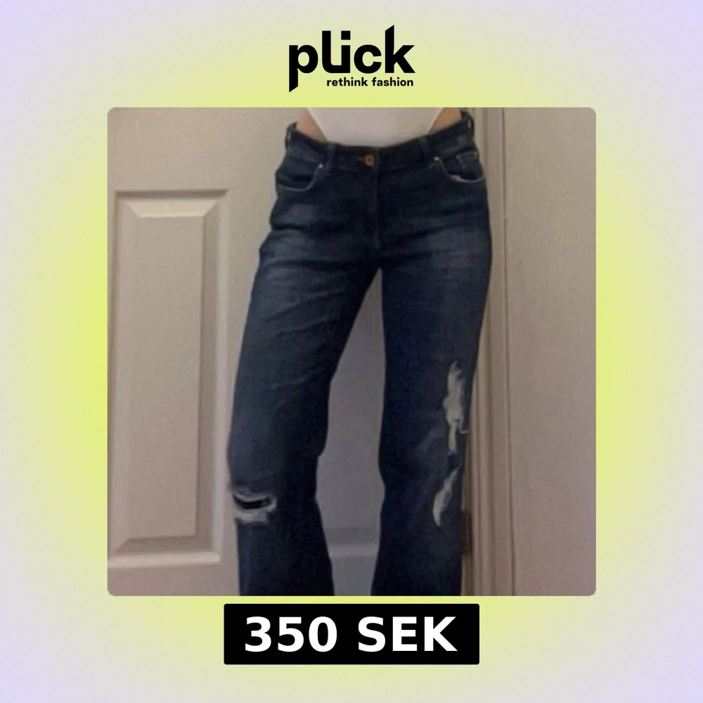 Snygga mörkblå jeans med slitningar på benen. De har en klassisk femficksdesign och knappgylf. Perfekta för en avslappnad stil.