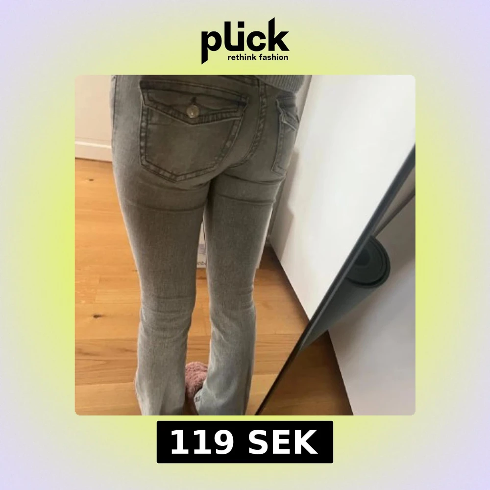 Säljer ett par grå jeans med bootcut och låg midja. Jeansen har klassiska fem fickor, knapp och dragkedja framtill samt snygga sömmar. Materialet är jeans och färgen är ljusgrå, vilket ger en fräsch och stilren look.