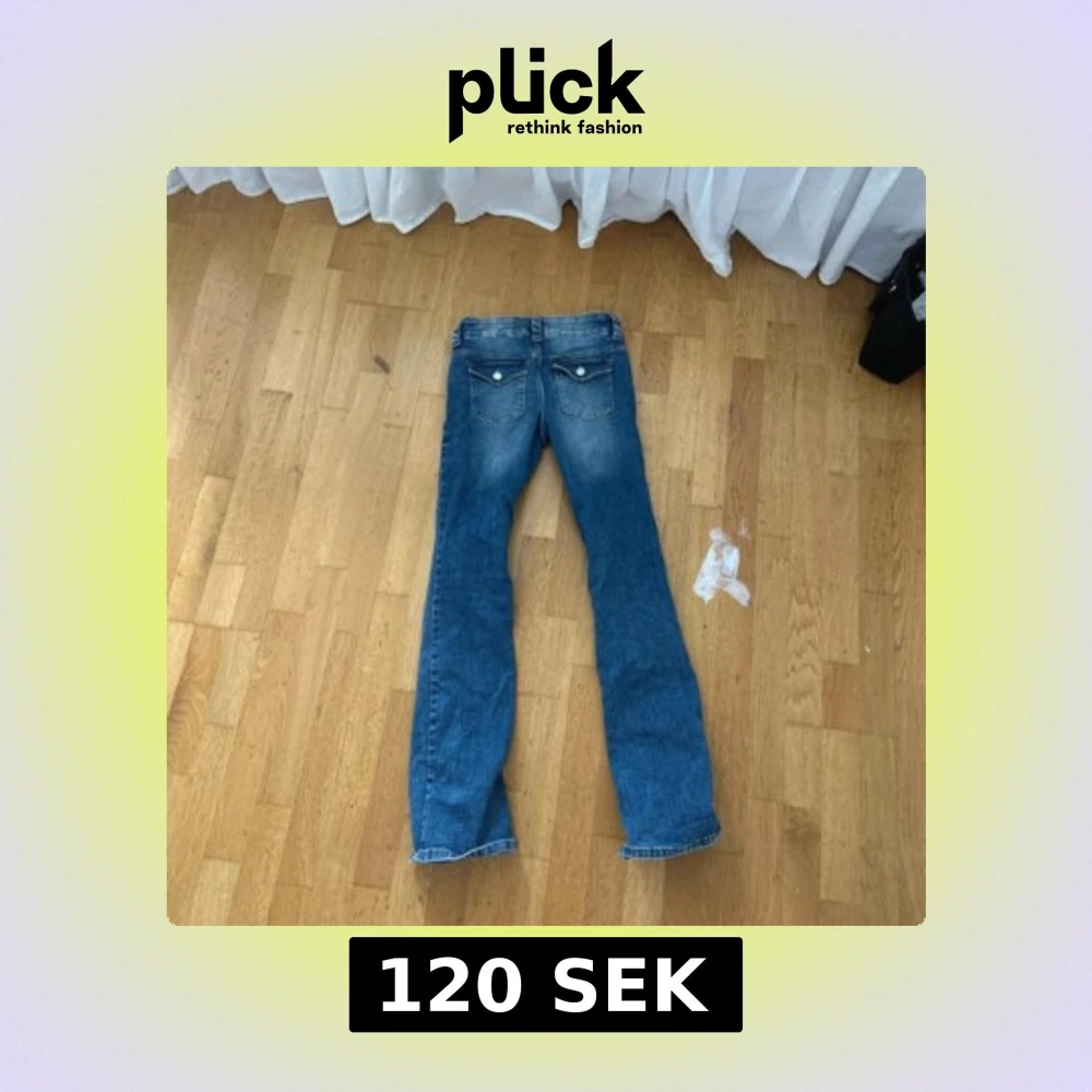 Snygga blå bootcut jeans med trendig ficksdesign och coola ficklock bak. Jeansen har en lätt tvättad look och är tillverkade i mjukt denimtyg. Perfekta för dig som gillar en avslappnad men trendig stil. Dom är köpta på barnavdelningen i 170 men skulle säga att de passar xs-s