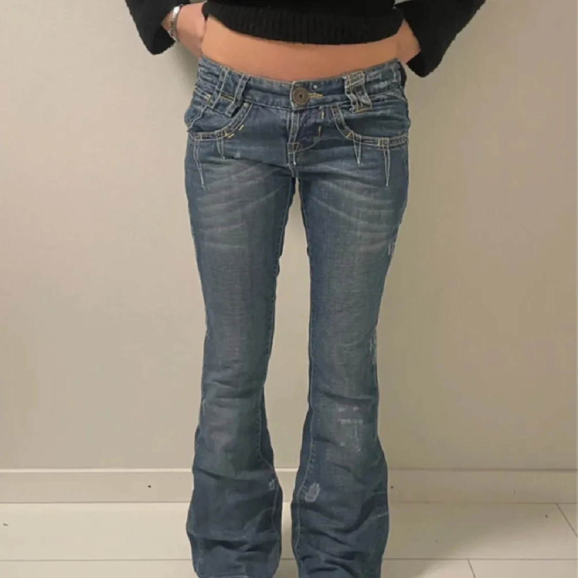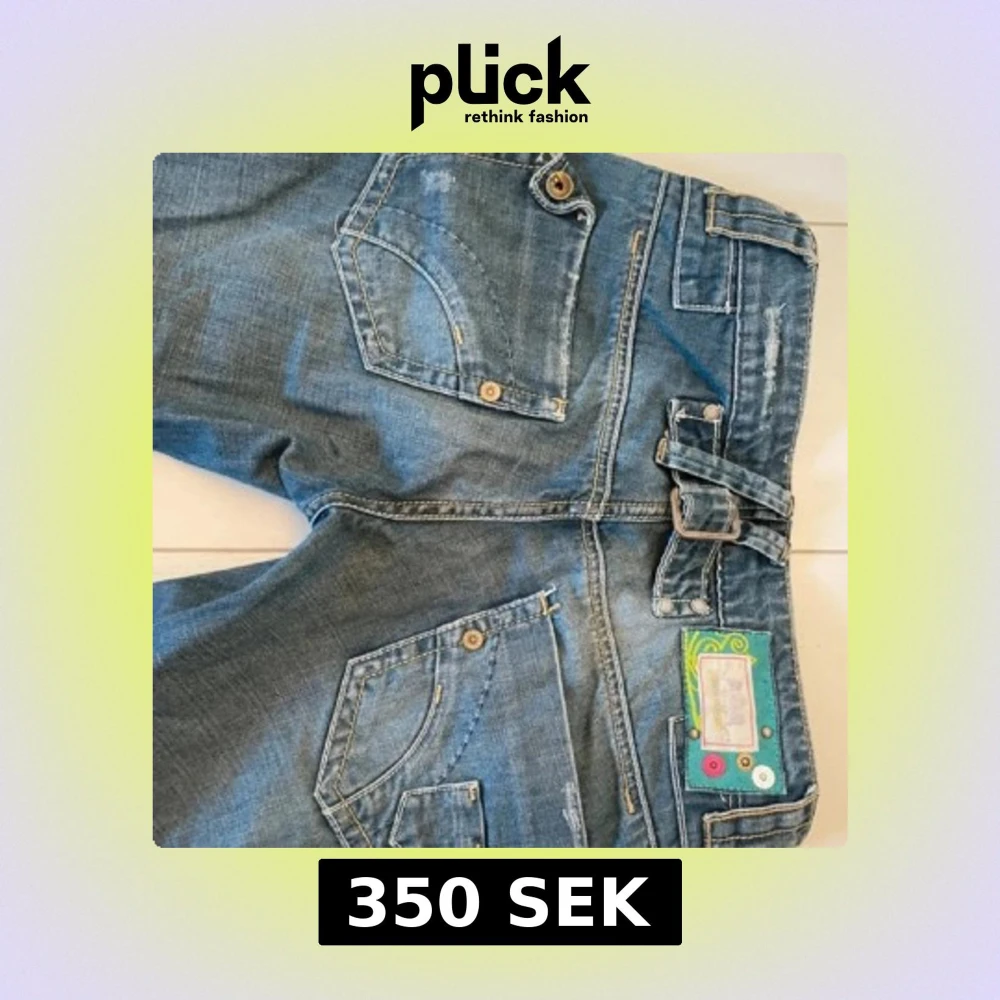 supersnygga lågmidjade jeans med lite coola detaljer, jag har köpt jeansen här på Plick men de kommer inte till användning då de tyvärr var för små för mig. midjemåttet rakt över är 37/38 och innebenslängden är 79/80. använd gärna köp nu. (lånade bilder från förra ägaren)
