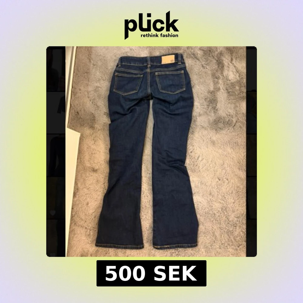 Snygga Lågmidjade mörkblå bootcut jeans med klassisk femficksdesign och kontrasterande sömmar. Midjemåttet är 37 cm rakt över och innerbenslängden är 76 cm.