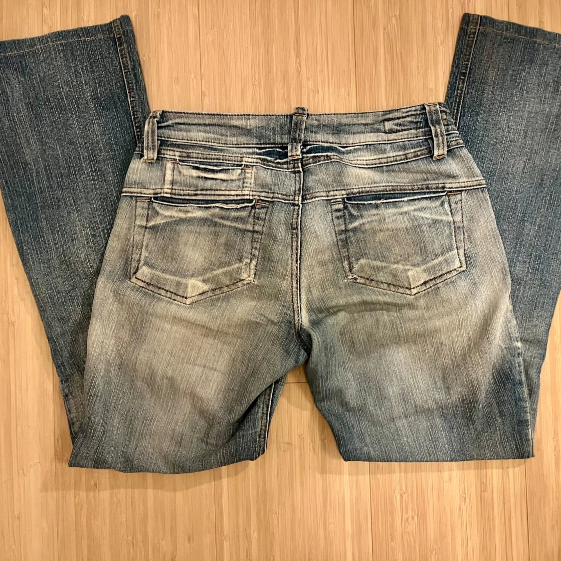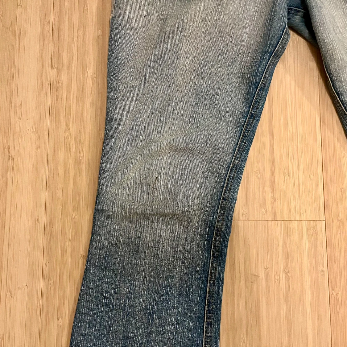 Lågmidjade bootcut jeans med en avslappnad känsla De är stretchiga och väldigt mjuka i tyget! De har en liten fläck på ena knät (bild 3), men det är inget man tänker på Midjemått: 36cm rakt över Innerbenslängd: 70cm
