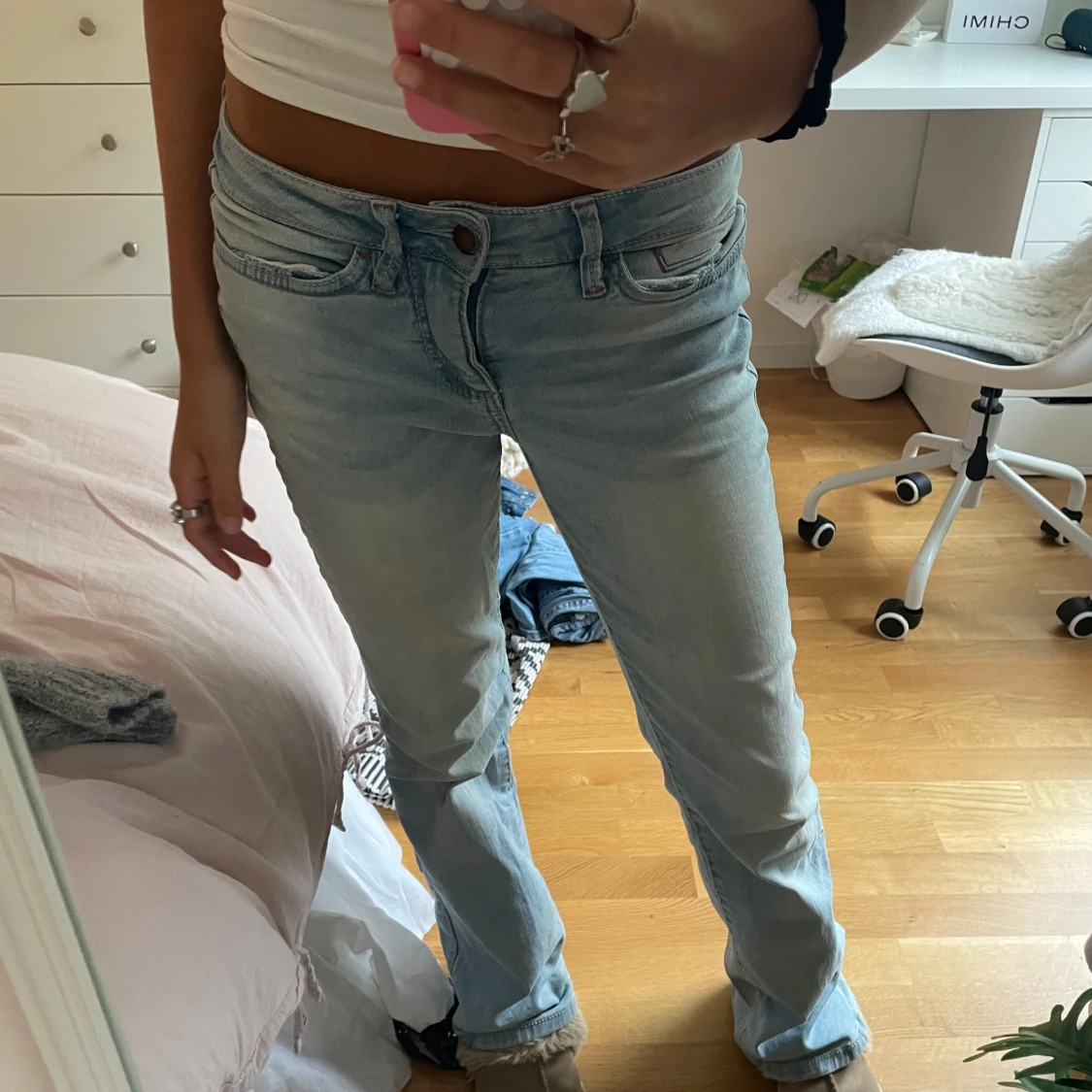 så najs utsvängda vintage jeans🙌🏽🙌🏽 innerben ca 75 cm o midjemått rakt över 33 cm men väldigt stretchiga💕