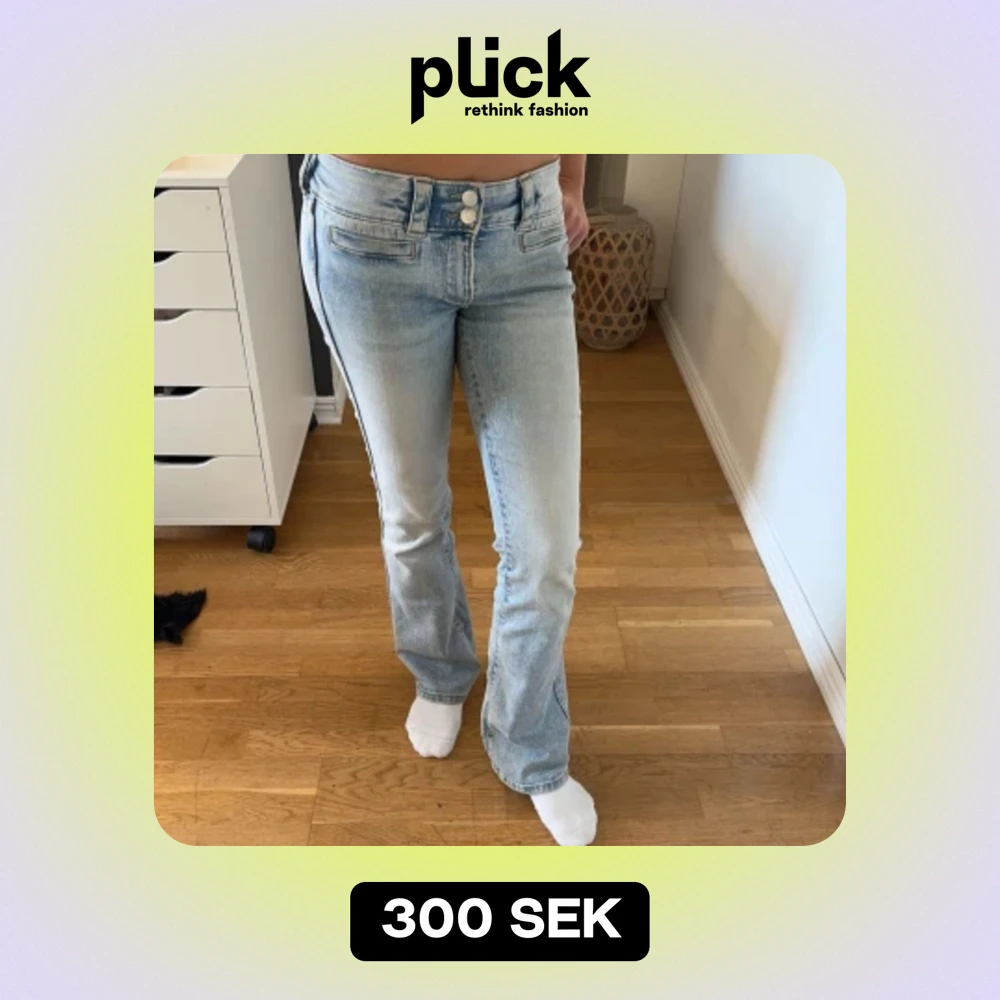 Säljer mina jätte snygga lågmidjade bootcut jeans från hm i st 164. Som referens brukar jag ha 32/34 i jeans och dom passar mig perfekt. Midjemåttet 35/36 cm rakt över och innebens längd ca 78 cm!❤️🔥