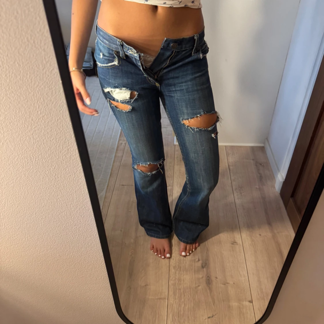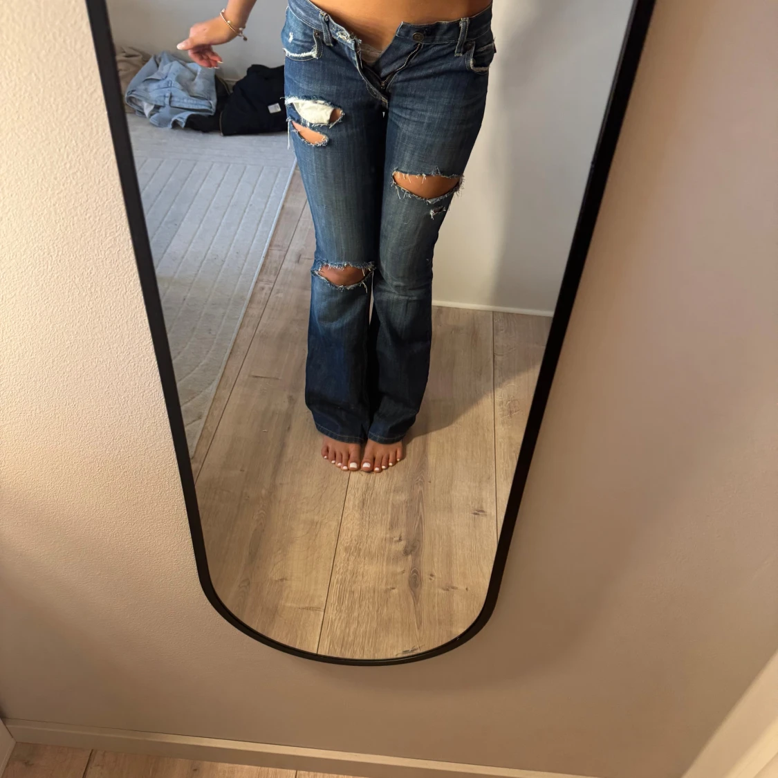 Säljer ett par blå jeans med låg midja och bootcut passform. Jeansen har flera slitningar och hål på låren och knäna. Tyvärr för små för mig. ❣️