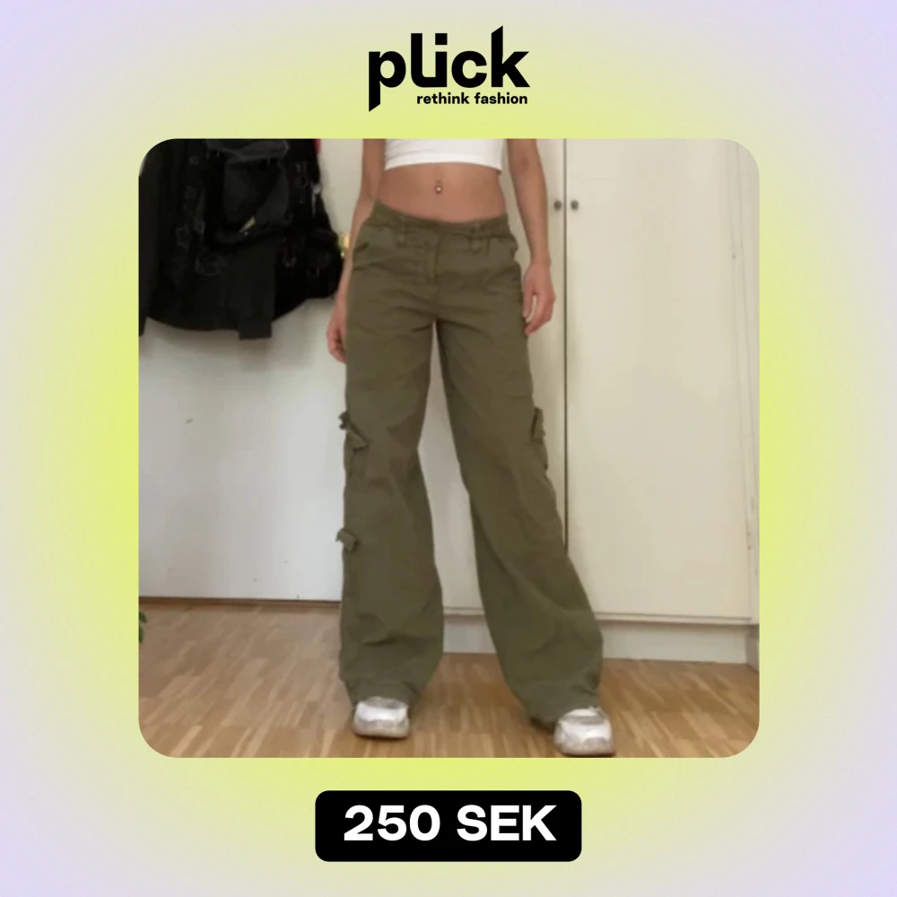 Lågmidjade gröna Cargobyxor från Urban Outfitters. Bra skick! Färgen stämmer bäst på sista bilden. Sitter ett snöre på insidan så dem är justerbara i midjan. Skriv om du har frågor eller vill ha fler bilder.