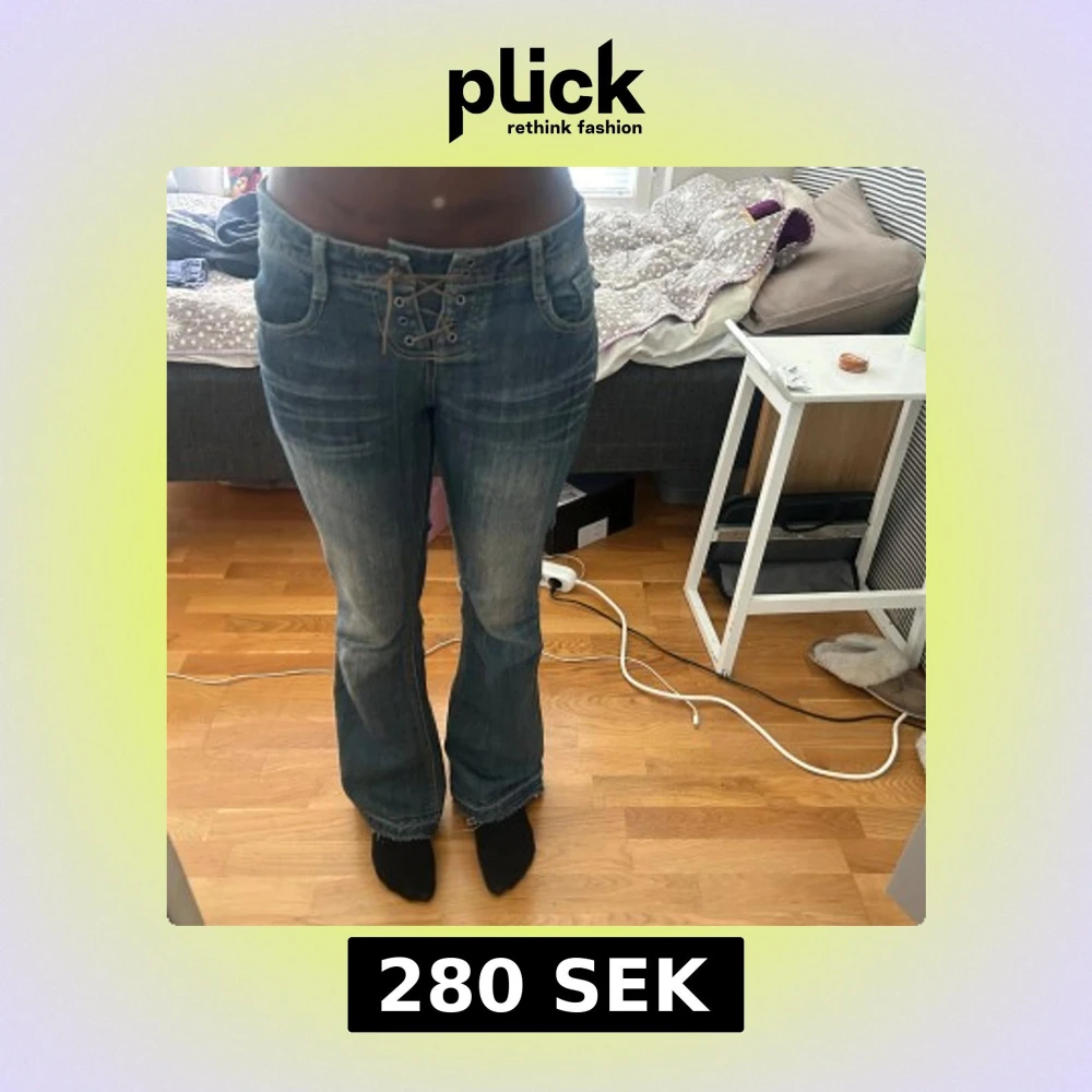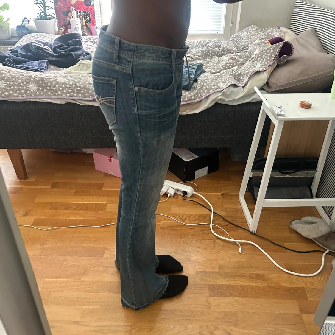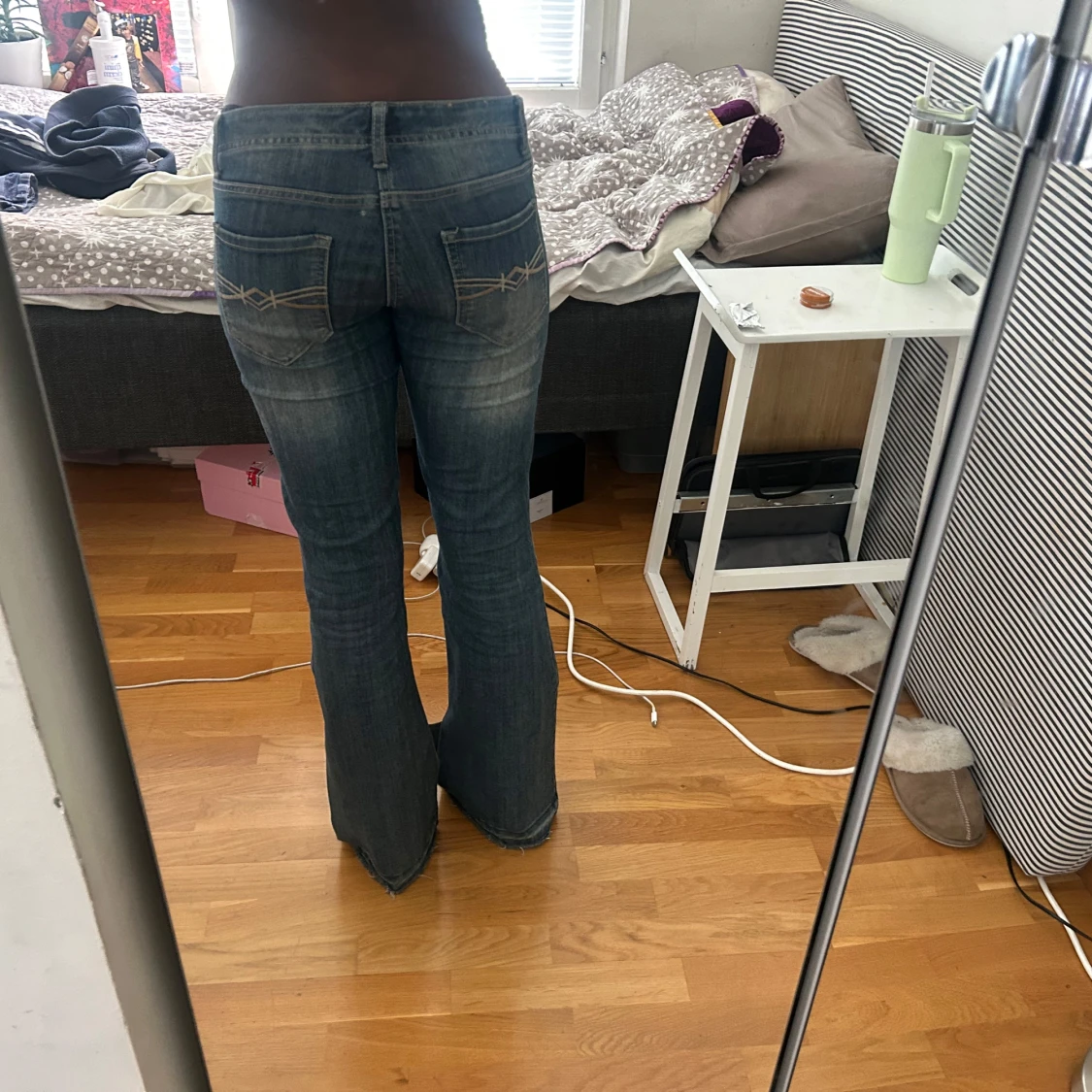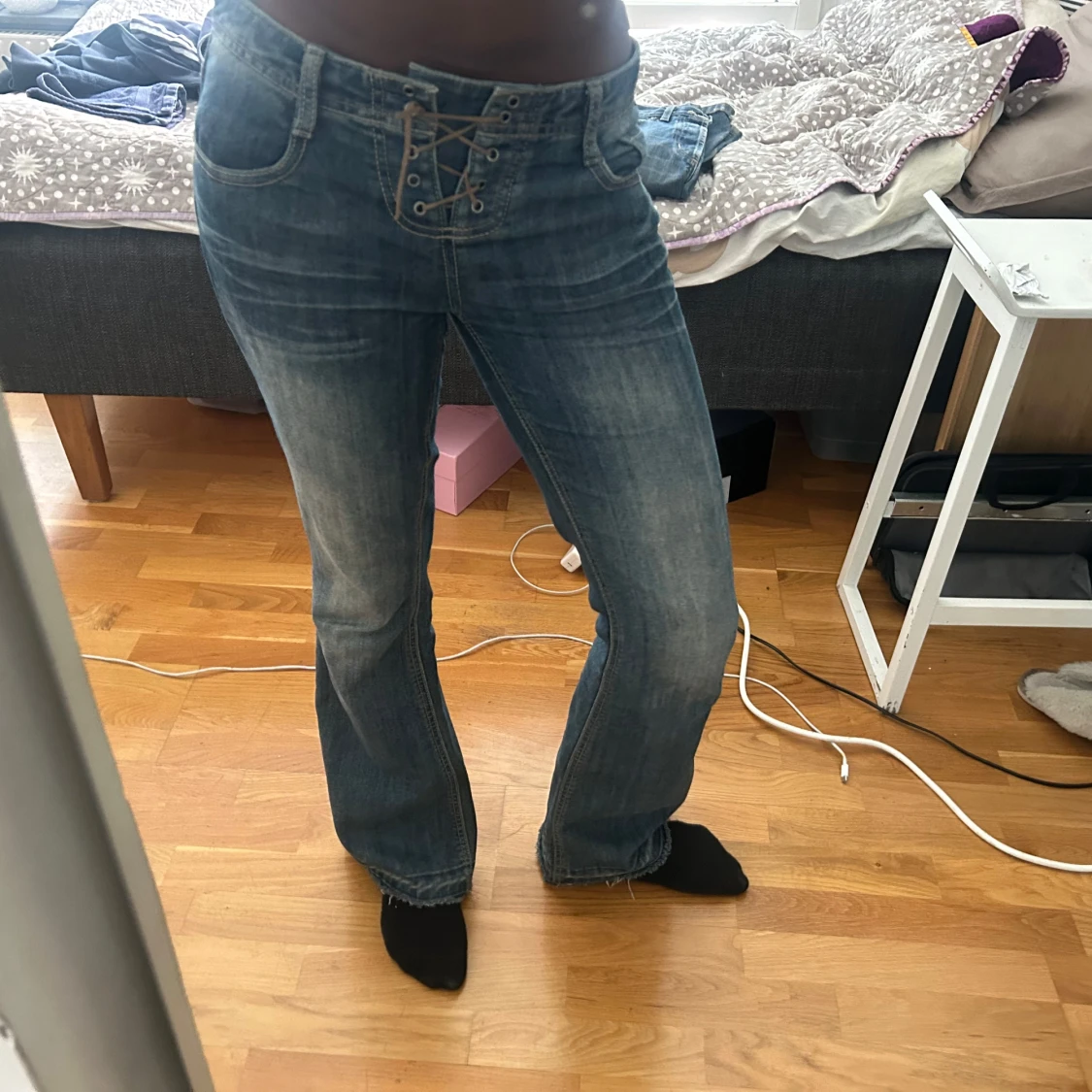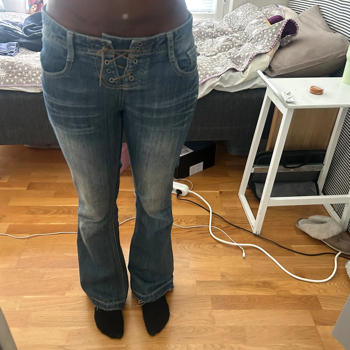 blå bootcut jeans med snörning framtill i midjan och broderade detaljer på bakfickorna.