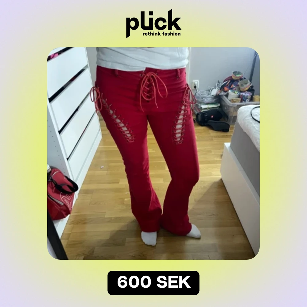 Super coola röda jeans med knytning från EDIKTED! Super bra skick bara använda ett fåtal gånger. Storlek M men passar även S