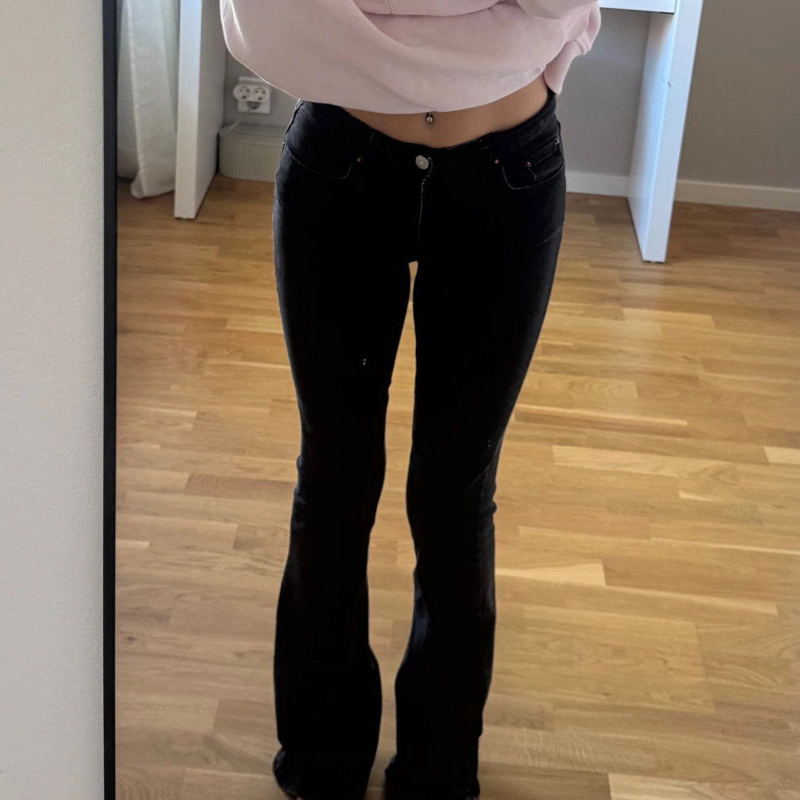 Säljer ett par svarta jeans med bootcut-modell och låg midja. Byxorna har klassisk femficksdesign och sitter tight upptill med utsvängda ben. Använda men i bra skick.