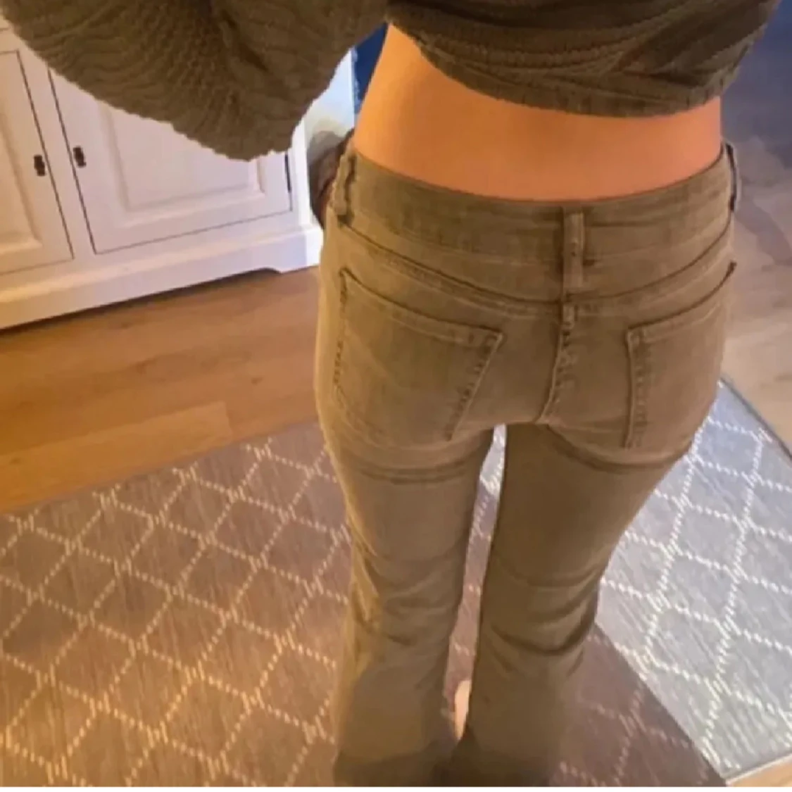 Säljer ett par lågmidjade grå jeans med bootcut passform. Jeansen har klassisk femficksdesign, knapp- och dragkedjestängning samt lätt slitna detaljer. Perfekta för dig som gillar en retro vibe.