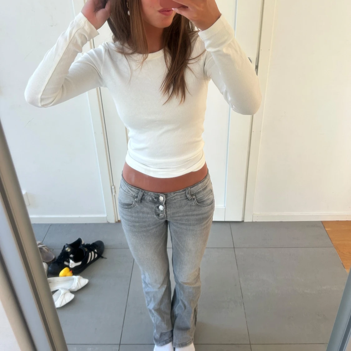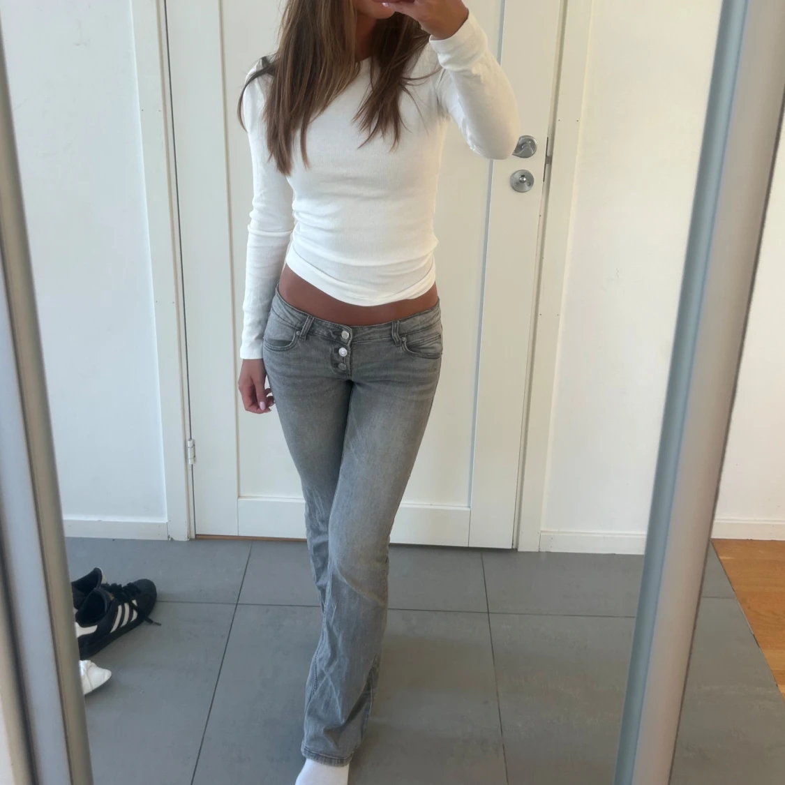 Säljer dessa superfina lågmidjade gråa jeans köpte för länge sen på Gina tricot!🥰 as cool knapp detalj på framsidan vid gylfen! de är slutsålda, i jättefint skick❤️ passar storlek XS