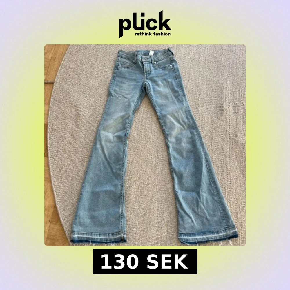 Ljusblå jeans med bootcut passform och lågmidjade. Jeansen är sprättade där nere och passar mig som är 170 cm, mer åt det för långa hållet än korta.
