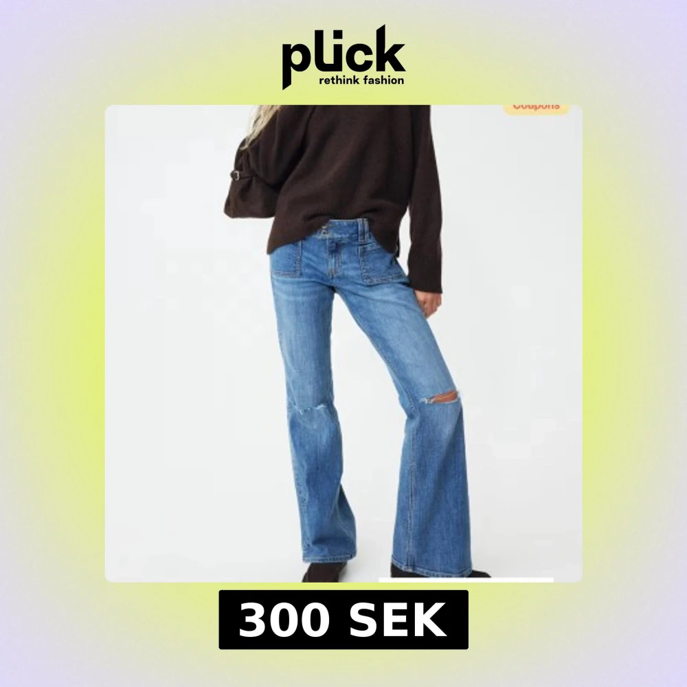 Snygga blå bootcut jeans med slitningar på knäna och klassiska fickor fram. Jeansen har låg midja och är endast använda 1 gång.🤗passar xs-s