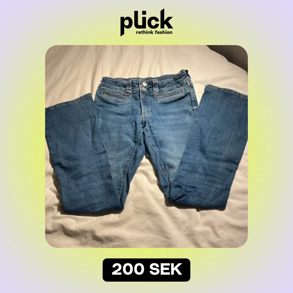 Ett par lågmidajde utsvängda jeans som min syster växt ur. En absolut favorit! Lite snygga detaljer på ena benet. 📍Storlek: 158. Pris kan självklart diskuteras, och kontakta mig för flera bilder 💗
