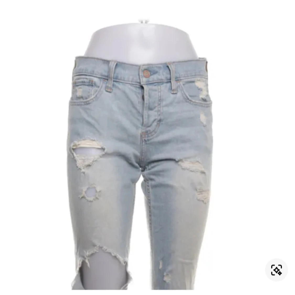 Ljusblåa lågmidjade Hollister Vintage Boyfriend jeans med slitningar och hål på benen för en cool, avslappnad look. Byxorna har klassisk femficksdesign, bena på byxorna är utsydda till bootcut Jeans.