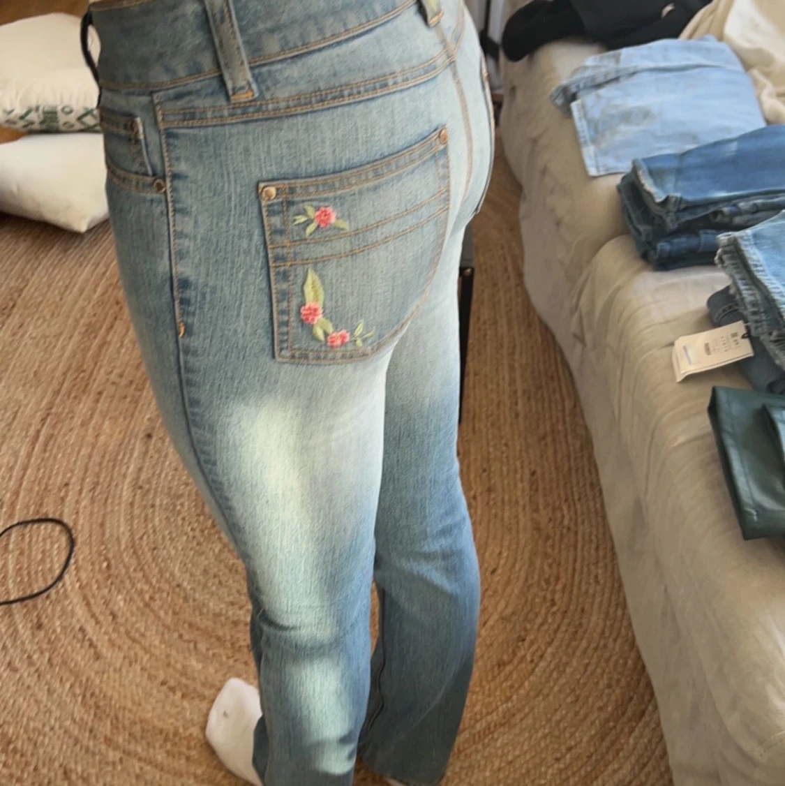 Lågmidjade jeans med broderi på. Superfina! Vet ej vart de är köpta. 225+frakt! Pris kan diskuteras😊 jag är 172, går ner till mina fötter😊