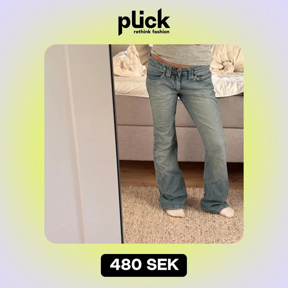 Lågmidjade bootcut jeans. Midjemåttet är 39cm och innerbenslängen är 77cm. Enda defekten är en liten slitning vid foten som visas i bild 3. 💕💕