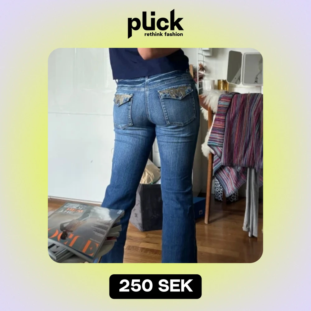Säljer ett par snygga blå jeans med bootcut-stil. De har coola broderade detaljer på bakfickorna som verkligen sticker ut. Perfekta för en avslappnad look men med en touch av stil. Passar bra till både vardag och fest!