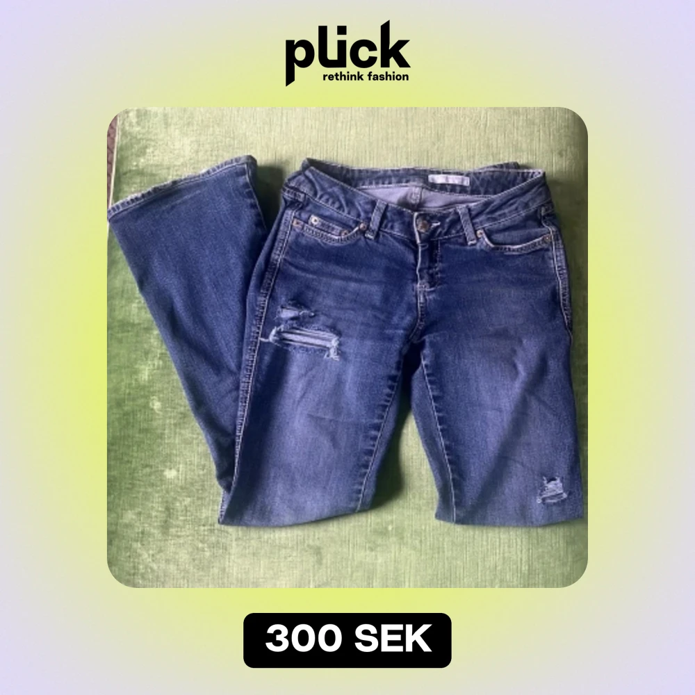 Jeans med skitsnygga slitningar, lågmidjade och bootcut. Mycket bra skick Midjemått: 37cm Innerbenslängd: 76cm