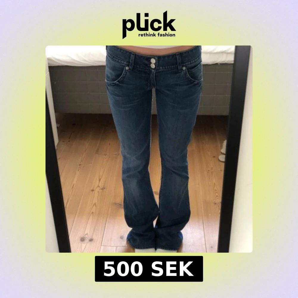 Midjemått: 39 cm (stretchiga så passar även större) innerbenslängd: 80 cm. Säljer dessa så snygga lågmidjade jeansen med bootcut passform. Jeansen har dubbla knappar framtill, och coola fickor baktill. Använda men i bra skick!Bara att skriva vid frågor💗 Jag är bortrest och kan inte posta paket om man köper, så om man tänkt att köpa får man göra det efter 1 Juli!🥰